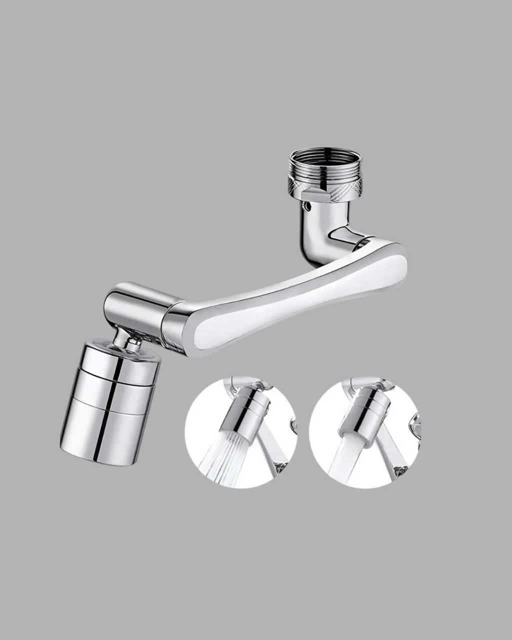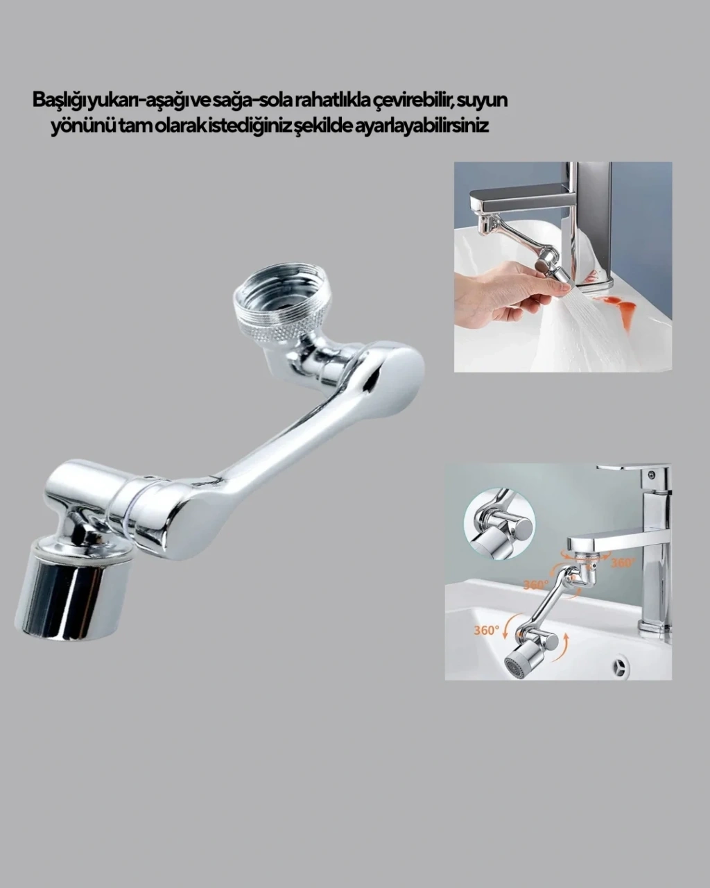 Günlük kullanımda musluk başlıklarının yetersiz kaldığı noktalarda devreye giren 1080° dönebilen robotik kol havalandırıcı, lavabo kullanımına tamamen yeni bir boyut kazandırmak için tasarlanmış fonksiyonel bir üründür. Üç segmentli özel robotik kol yapısı sayesinde suyu istediğiniz yöne yönlendirebilir, musluk başlığını yukarı-aşağı ve sağa-sola kolayca hareket ettirebilirsiniz. Toplamda 1080 derece dönebilen esnek eklem sistemi, geleneksel musluklara göre çok daha geniş bir kullanım alanı sağlar.Bu musluk atı sayesinde lavabonun her köşesine ulaşmak mümkün olur. Yüz yıkarken, diş fırçalarken, mutfakta sebze meyve yıkarken, bebek eşyalarını temizlerken veya tıraş olurken suyun istediğiniz şekilde yönlenmesi büyük kolaylık sağlar. Özellikle hareket kabiliyeti kısıtlı bireyler, çocuklar ve yaşlılar için musluk kullanımını pratik hale getirir. Suyun yönünü tek hareketle değiştirebilmeniz, günlük hijyen süreçlerini çok daha hızlı ve konforlu hale getirir.Havalandırıcı uç yapısı, suyun basıncını dengeler ve sıçramayı azaltır. Böylece hem su tasarrufu sağlanır hem de lavabonun çevresi daha temiz kalır. Ürün, dayanıklı metal ve ABS malzeme karışımından üretilmiştir. Bu sayede kire, paslanmaya ve uzun süreli kullanıma karşı direnç gösterir. Eklem bölgelerinde bulunan sıkı bağlantı mekanizması uzun vadede gevşeme yapmaz, musluk başlığının dengeli şekilde hareket etmesini sağlar.Kurulumu son derece kolaydır. Standart musluk başlıklarıyla uyumlu tasarımı sayesinde ek bir tesisat gerektirmez; sadece musluğa vidalayarak anında kullanmaya başlayabilirsiniz. Mutfak, banyo, lavabo, tuvalet el yıkama alanları gibi pek çok yerde rahatlıkla kullanılabilir.Hem şık hem fonksiyonel bu havalandırıcı, musluğu daha modern, daha kullanışlı ve daha ergonomik bir hale getirir. Günlük yaşamda hız ve kolaylık arayanların mutlaka sahip olması gereken pratik bir çözümdür.