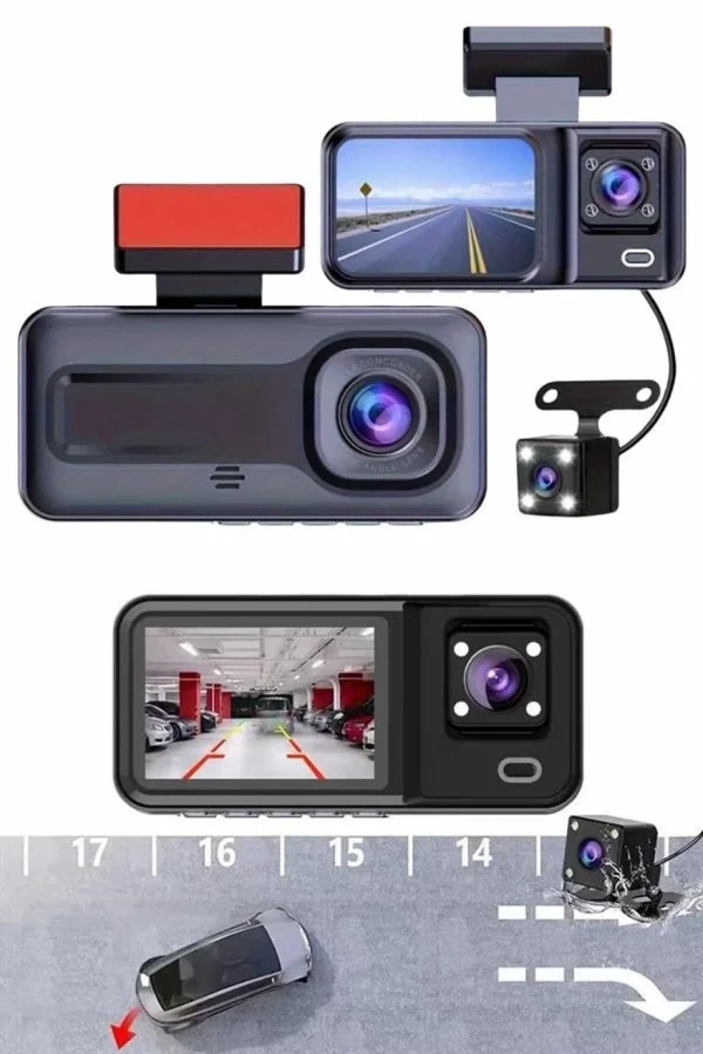 Bu yüksek donanımlı araç kamerası sistemi, sürüş güvenliğini artırmak ve her anı kayıt altına almak isteyen sürücüler için tasarlanmıştır. Ürün, biri ön, biri iç, biri de arka olmak üzere üç ayrı kamera ile donatılmıştır. Ön kamera 1080P Full HD çözünürlük sunarken, iç ve arka kameralar 720P kalitesindedir. Böylece aracın önünden arkasına kadar her yönü detaylı biçimde kayda alınır.2 inçlik IPS ekran, hem canlı görüntüleme hem de menüler arasında kolay geçiş sağlarken, 170 derece geniş açılı lensi sayesinde sürüş esnasında daha fazla alanı görebilmenize olanak tanır. Araç geri vitese alındığında arka kamera otomatik olarak devreye girer ve park çizgileri ekrana yansıtılarak park etme işlemini oldukça kolaylaştırır. Ürünle birlikte gelen arka kamera hediye olarak sunulmaktadır.G-sensör özelliği sayesinde, araç park halindeyken bile herhangi bir sarsıntı, darbe veya ani hareket algılandığında cihaz otomatik olarak kayıt yapar. Böylece olası kazalar ya da zarar görme durumları anında belge altına alınır. Döngüsel kayıt teknolojisi, hafıza dolduğunda eski görüntülerin üzerine yeni kayıt yapılmasını sağlar, bu da sürekli kullanım için pratiklik kazandırır.64 GB’a kadar microSD kart desteği sunan bu sistem, geniş kayıt kapasitesiyle uzun yolculuklarda bile kesintisiz video alabilme imkânı tanır. Kompakt ve aerodinamik tasarımı sayesinde görüş alanını engellemez ve araç estetiğiyle uyumlu şekilde entegre olur. Hem şehir içi kullanımlar hem de uzun yol seyahatleri için vazgeçilmez bir güvenlik çözümüdür.