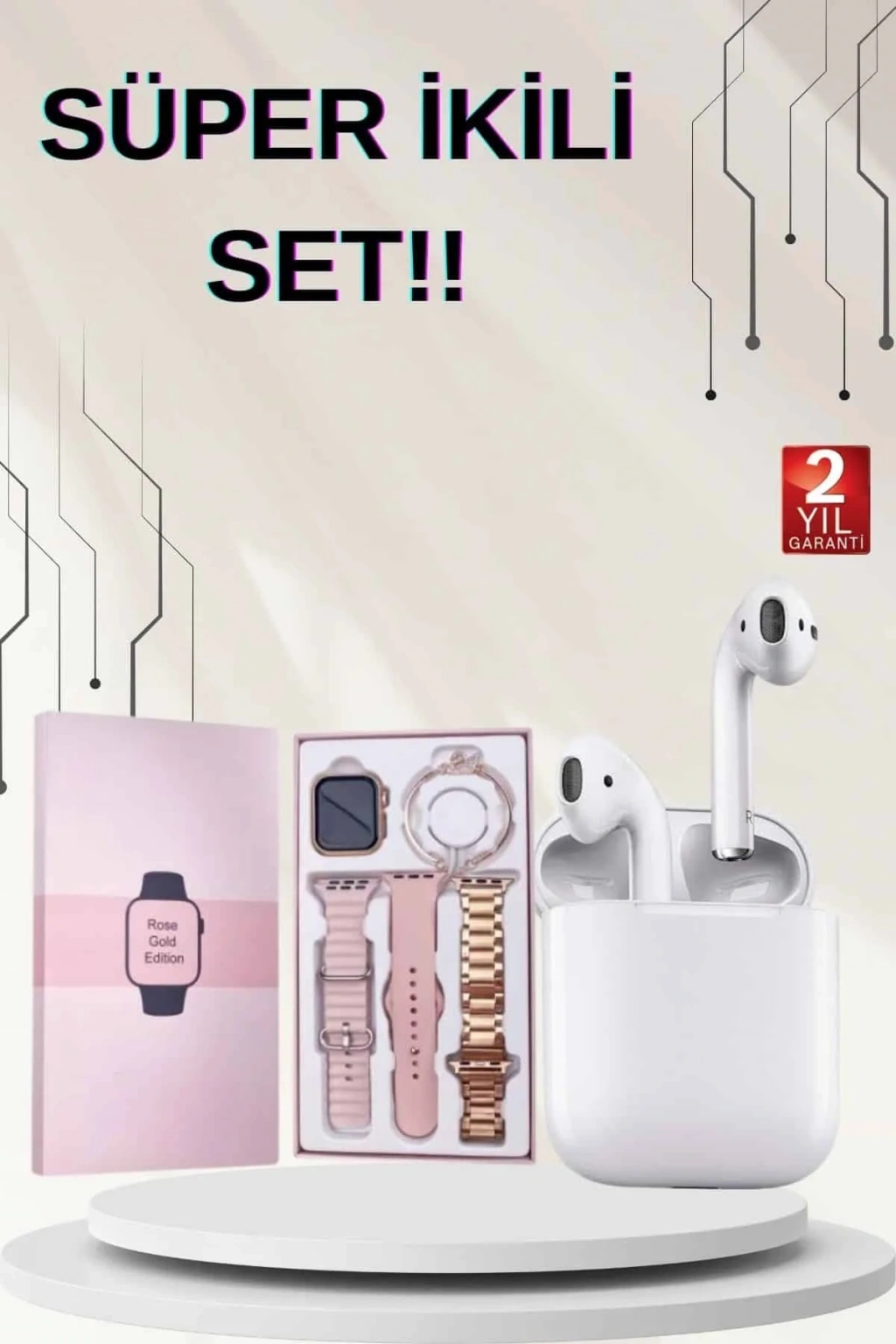 AKILLI SAATYeni Nesil Mini Kadın Akıllı Saat, şıklığı ve fonksiyonelliği bir araya getiren tasarımıyla kadınlar için ideal bir seçenek sunuyor. Almanya üretimi ultra dayanıklı model, özel wireless şarj özellikleriyle öne çıkıyor ve Türkçe menüsü sayesinde kullanıcı dostudur. Kutu içeriğinde, mini akıllı saat, 3 farklı kordon, hediye bileklik, wireless şarj kablosu ve kullanım kılavuzu bulunmaktadır. Şık pembe kutusu, hediye olarak tercih edilmesini sağlayan bir özellik taşır. 41 mm kavisli oval kenarlı yeni tasarımı ve 1,70 inç AMOLED ekranı ile yüksek çözünürlükte HD görüntü sağlar.Saat, nabız ölçer, uyku izleyici, kan basıncı, tansiyon, EKG ve vücut sıcaklığı ölçer gibi sağlık izleme özellikleriyle sağlığınızı takip etmenizi sağlar. 117 farklı spor modu ve adım, kalori, kalp ritmi ölçme gibi özellikler ile aktivite takibini oldukça detaylı yapabilirsiniz. Ayrıca akıllı hatırlatıcılar sayesinde su içme ve hareketsizlik gibi hatırlatmalar alabilir, tüm bildirimleri ve mesajları anında saatinizde görebilirsiniz.Bluetooth bağlantısı ile yüksek kaliteli müzik dinleyebilir ve uzaktan fotoğraf çekme özelliği ile fotoğraflarınızı kolayca çekebilirsiniz. Suya dayanıklı yapısı, günlük kullanımda sıklıkla tercih edilmesini sağlar; ancak deniz ve havuz gibi basınçlı suya karşı su geçirmez.Saatin sunduğu diğer özellikler arasında Türkçe ve çoklu dil desteği, saatimi bul, telefonumu bul, alarm, kronometre, hava durumu, hesap makinesi gibi fonksiyonlar bulunur. Kordonu değiştirilebilir, bu sayede kişisel tercihlere göre tasarımı özelleştirilebilir. 24 ay garanti süresi ile kullanıcılarına güvenli bir deneyim sunar.KULAKLIK2.Nesil kulak içi Bluetooth kulaklık, ergonomik tasarımı sayesinde kulağa tam oturarak konforlu bir kullanım sunar. Alerji yapmayan ve cildi tahriş etmeyen yapısı ile uzun süreli kullanımda bile rahatlık sağlar. iOS ve Mac ile tam uyumlu olup, dokunmatik sensörleri sayesinde müzik geçişlerini ve çağrı kontrollerini kolayca yapmanıza olanak tanır. Güçlü pil ömrü ile uzun süreli kullanım sunarken, gürültü önleyici özelliği sayesinde dış mekanda yapılan konuşmalarda net bir ses aktarımı sağlar. Hassas mikrofonu, uzak mesafeden gelen sesleri bile algılayarak kesintisiz iletişim imkanı sunar. Suya ve toza dayanıklı yapısı sayesinde günlük kullanımda dayanıklılık gösterir. Şık beyaz tasarımıyla dikkat çeken bu model, İOS cihazlarla sorunsuz bir şekilde eşleşerek kaliteli bir kablosuz deneyim yaşatır.