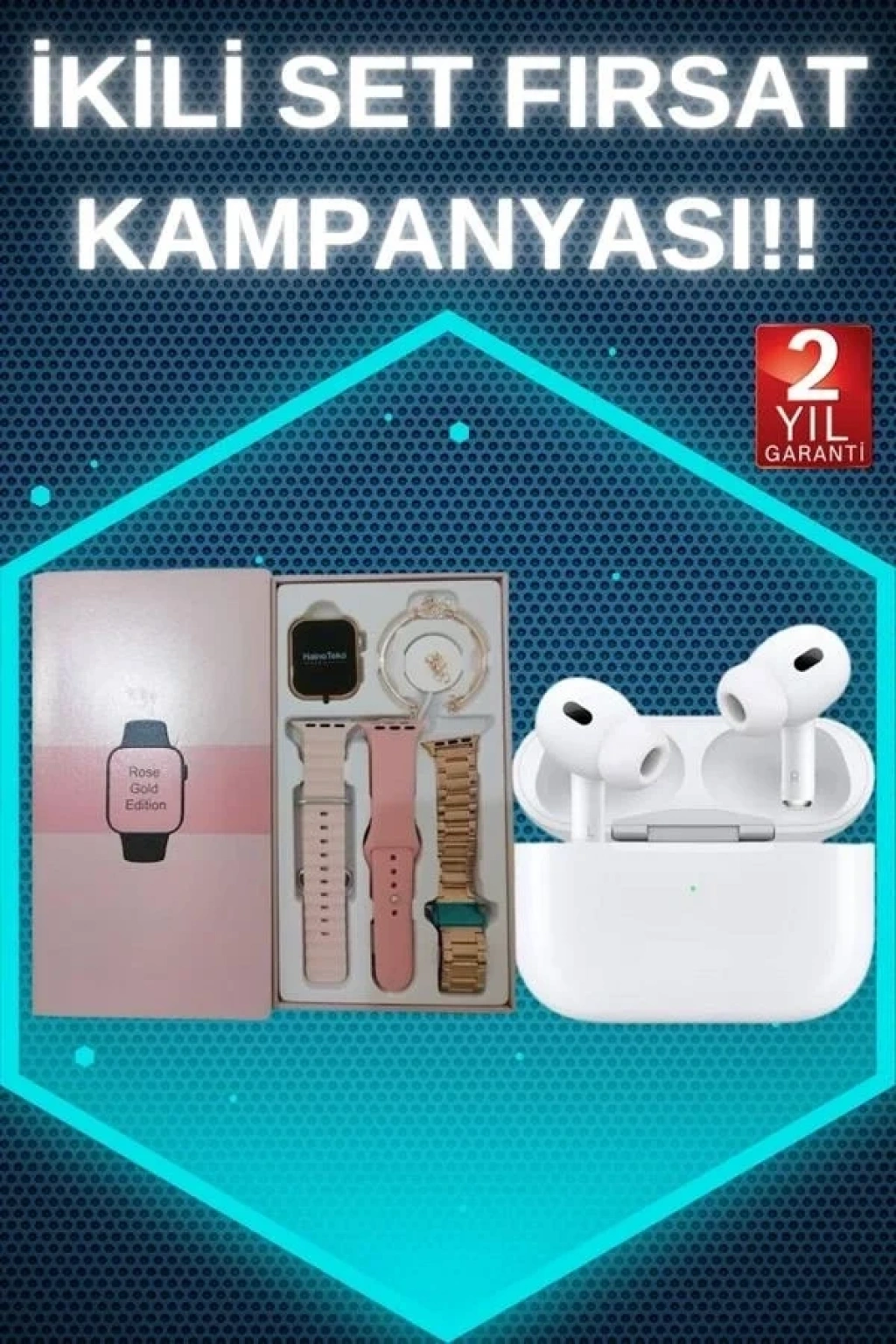 AKILLI SAATYeni Nesil Mini Kadın Akıllı Saat, şıklığı ve fonksiyonelliği bir araya getiren tasarımıyla kadınlar için ideal bir seçenek sunuyor. Almanya üretimi ultra dayanıklı model, özel wireless şarj özellikleriyle öne çıkıyor ve Türkçe menüsü sayesinde kullanıcı dostudur. Kutu içeriğinde, mini akıllı saat, 3 farklı kordon, hediye bileklik, wireless şarj kablosu ve kullanım kılavuzu bulunmaktadır. Şık pembe kutusu, hediye olarak tercih edilmesini sağlayan bir özellik taşır. 41 mm kavisli oval kenarlı yeni tasarımı ve 1,70 inç AMOLED ekranı ile yüksek çözünürlükte HD görüntü sağlar.Saat, nabız ölçer, uyku izleyici, kan basıncı, tansiyon, EKG ve vücut sıcaklığı ölçer gibi sağlık izleme özellikleriyle sağlığınızı takip etmenizi sağlar. 117 farklı spor modu ve adım, kalori, kalp ritmi ölçme gibi özellikler ile aktivite takibini oldukça detaylı yapabilirsiniz. Ayrıca akıllı hatırlatıcılar sayesinde su içme ve hareketsizlik gibi hatırlatmalar alabilir, tüm bildirimleri ve mesajları anında saatinizde görebilirsiniz.Bluetooth bağlantısı ile yüksek kaliteli müzik dinleyebilir ve uzaktan fotoğraf çekme özelliği ile fotoğraflarınızı kolayca çekebilirsiniz. Suya dayanıklı yapısı, günlük kullanımda sıklıkla tercih edilmesini sağlar; ancak deniz ve havuz gibi basınçlı suya karşı su geçirmez.Saatin sunduğu diğer özellikler arasında Türkçe ve çoklu dil desteği, saatimi bul, telefonumu bul, alarm, kronometre, hava durumu, hesap makinesi gibi fonksiyonlar bulunur. Kordonu değiştirilebilir, bu sayede kişisel tercihlere göre tasarımı özelleştirilebilir. 24 ay garanti süresi ile kullanıcılarına güvenli bir deneyim sunar.KULAKLIKkulak içi Pro kulaklık, özel dizaynı sayesinde kulağa tam oturarak sesleri net bir şekilde duymanıza yardımcı olur. Alerji yapmayan ve rahatsızlık hissini engelleyen yapısı ile konforlu bir kullanım sunar. iOS ve Mac uyumlu olan bu kablosuz Bluetooth kulaklık, dokunmatik sensörleri sayesinde parmak dokunuşlarıyla kolayca yönetilebilir. Uzun süre dayanan pil gücü ile kesintisiz bir deneyim sağlarken, gürültü önleyici özelliği sayesinde dış mekan konuşmalarında karşı tarafa temiz ve net bir ses iletir. Mikrofonu, uzak mesafelerden dahi sesleri algılayarak kaliteli bir iletişim imkanı sunar. Beyaz renkli ve şık tasarıma sahip model, suya ve toza dayanıklı yapısıyla günlük kullanımda güvenli bir tercih oluşturur. Dokunmatik kontrol özelliği ile müzik geçişlerini kolayca yapabilir, İOS telefonlarla tam uyumluluk sağlayarak sorunsuz bir bağlantı deneyimi yaşayabilirsiniz.