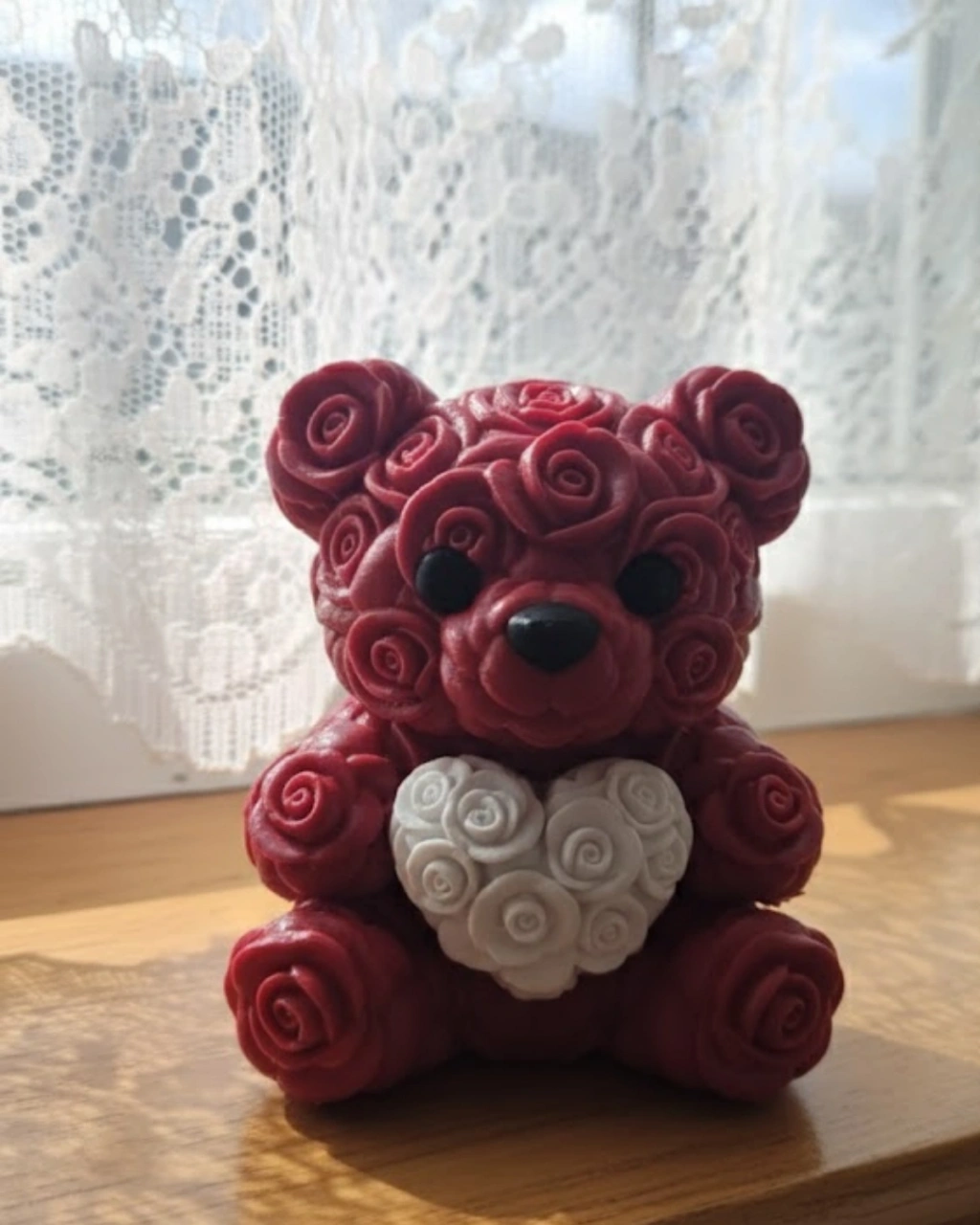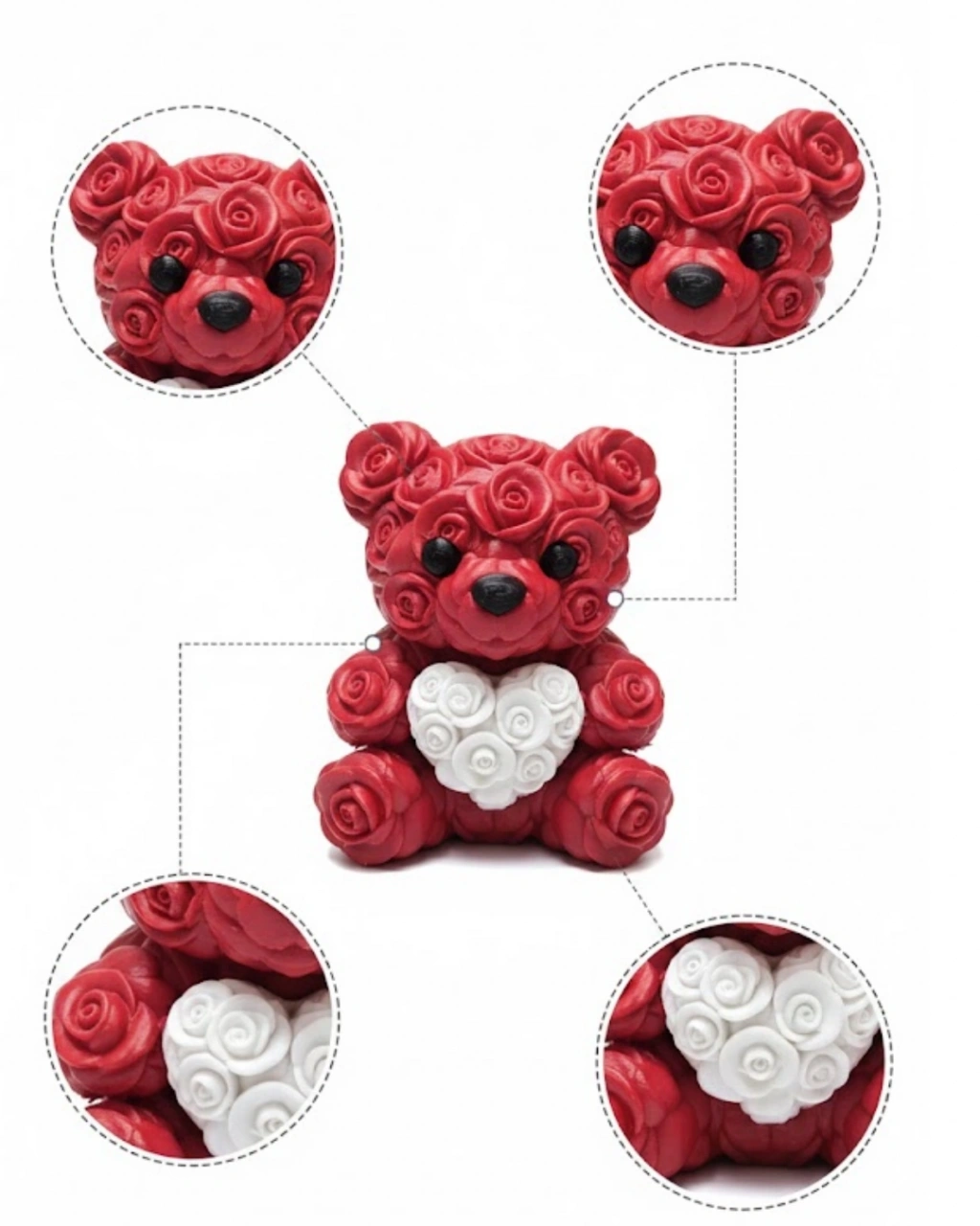 10 cm boyutundaki bu kalp ayıcık, 3D baskı teknolojisi ile üretilmiş şık bir dekoratif objedir. Gül kabartmaları ürüne zengin bir görünüm kazandırır. Göğsünde taşıdığı kalp figürü ile sevgi temasını güçlü şekilde yansıtır.Küçük ama etkileyici tasarımı sayesinde bulunduğu ortamda dikkat çeker. Hediye alternatifi olarak da oldukça anlamlıdır.Dayanıklı yapısı sayesinde uzun süre formunu korur.