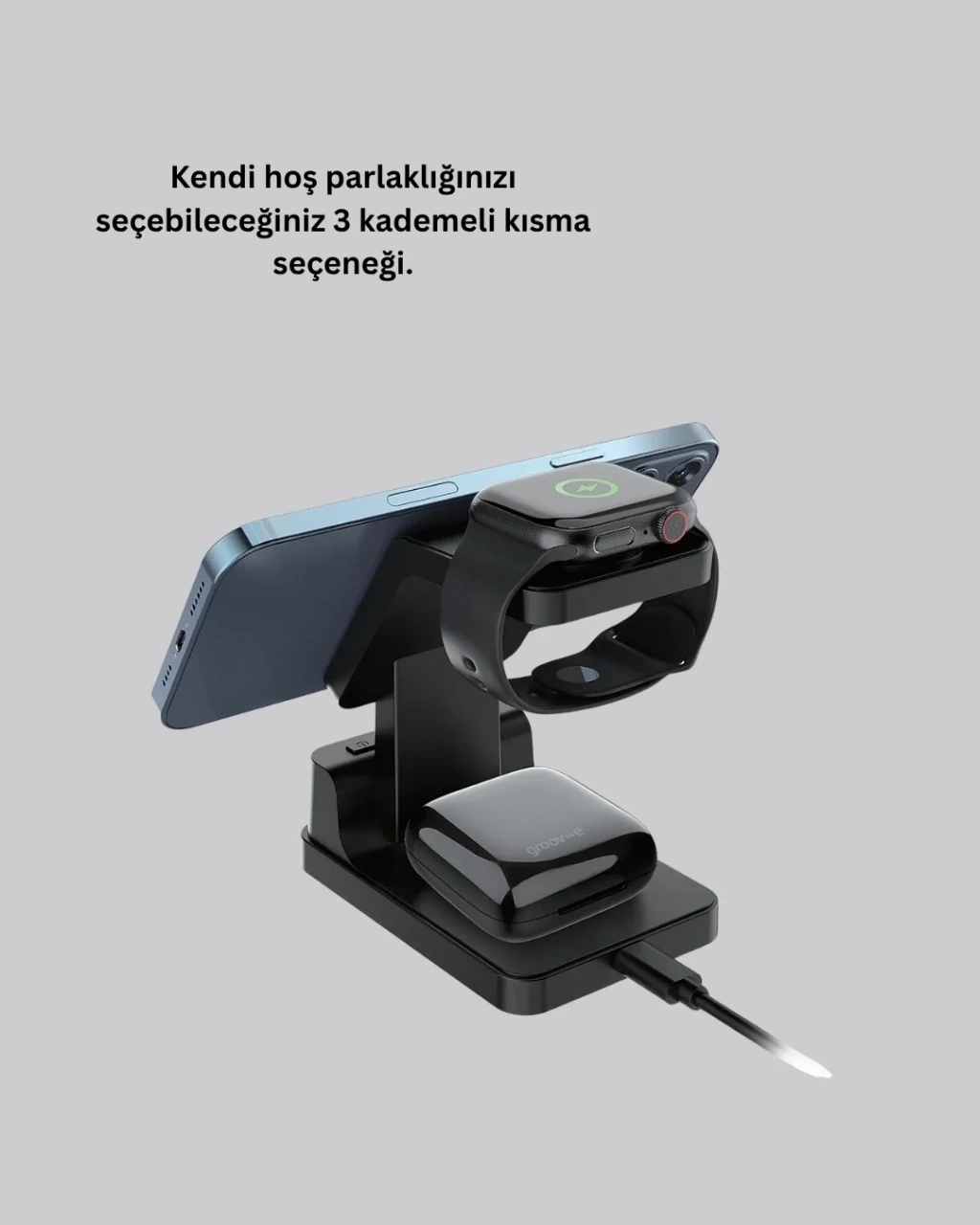 Günün her anında düzenli, şık ve verimli olun!Bu kablosuz şarj istasyonu, dijital saat ekranı ve hızlı şarj özelliklerini bir arada sunar.iPhone, Apple Watch ve AirPods gibi cihazlarınızı tek seferde şarj etmenize olanak tanır.Saat ekranı 3 kademeli parlaklık seçeneğine sahiptir.İster loş bir ışıkta uyuyun ister gündüz masa başında çalışın — her ortamda uygun görünürlük sağlar.Akıllı koruma sistemi, sıcaklık artışını ve aşırı akım riskini önler.Yanmaz ABS malzeme, cihazın uzun ömürlü kullanımını destekler.Dahili bellek pili sayesinde elektrik kesintilerinde bile saat ayarınız korunur.Kompakt boyutu sayesinde yatak odası, ofis veya çalışma masası için mükemmel bir tercih olur.Fonksiyonelliğiyle olduğu kadar es tasarımıyla da dikkat çeker.