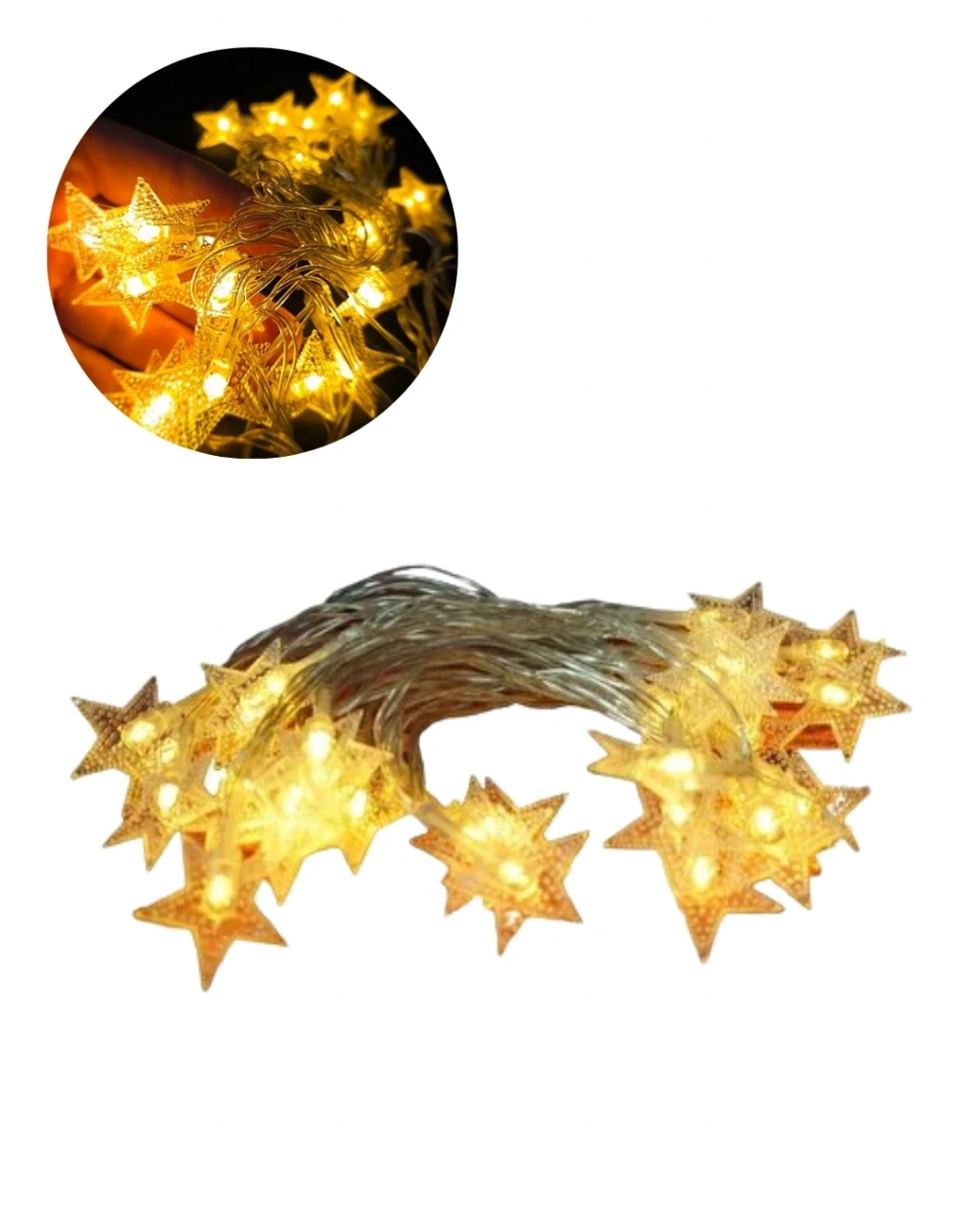 Yıldız şeklinde LED detayları ile es bir görünüm sunan bu aydınlatma zinciri, iç mekan dekorasyonunda hem görsel hem fonksiyonel bir çözüm sağlar. 20 adet yıldız formundaki LED sayesinde homojen ve dengeli bir ışık dağılımı oluşturur.Çocuk odası, yatak başı aydınlatması, parti dekorasyonları ve özel etkinlik süslemeleri için ideal bir üründür. Günışığı beyaz tonuyla ortamı daha canlı ve ferah gösterir.Dayanıklı yapısı ve uzun ömürlü LED sistemi sayesinde yıllarca kullanılabilir. Enerji tasarruflu tasarımı ile ekonomik bir çözümdür.