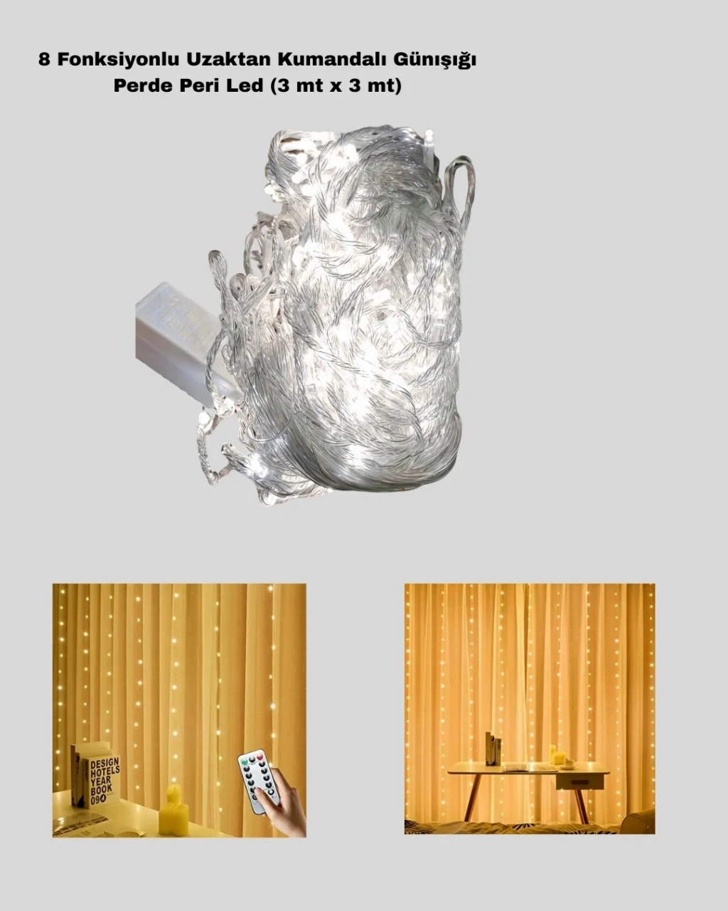 8 Fonksiyonlu Uzaktan Kumandalı Günışığı Perde Peri Led, yaşam alanlarınıza es, sıcak ve romantik bir atmosfer kazandırmak için tasarlanmış dekoratif bir aydınlatma çözümüdür. Özellikle doğum günü, nişan, söz, kına gecesi, evlilik teklifi, yıl dönümü gibi özel gün konseptlerinde mekânın havasını anında değiştiren bu ürün, aynı zamanda günlük kullanım için de son derece uygundur.Günışığı renk tonu sayesinde göz yormayan, yumuşak ve doğal bir aydınlatma sunar. Soğuk beyaz ışıkların aksine daha sıcak bir ambiyans oluşturur ve bulunduğu ortama huzurlu bir görünüm kazandırır. Perde tipi saçaklı yapısı, özellikle duvar, pencere, perde arkası, balkon, yatak başı ve fotoğraf köşeleri gibi alanlarda oldukça şık bir dekor oluşturur.Ürünle birlikte gelen uzaktan kumanda sayesinde 8 farklı ışık modu arasında kolayca geçiş yapılabilir. Sabit ışık, dalgalı geçişler, yavaş yanıp sönme gibi farklı animasyon seçenekleri ile ortama göre ışık ayarı yapılabilir. Kumanda üzerinde bulunan zamanlayıcı fonksiyonu sayesinde ürün 8 saat açık, 16 saat kapalı olacak şekilde otomatik olarak çalıştırılabilir. Bu özellik özellikle gece kullanımı için enerji tasarrufu sağlar.Parlaklık ayarı da kumanda üzerinden rahatlıkla kontrol edilebilir. + ve - tuşları ile ışık şiddeti azaltılabilir veya artırılabilir. Böylece loş bir ortamdan daha aydınlık bir atmosfere geçiş yapılabilir. USB bağlantı ile çalışması sayesinde adaptör, powerbank, bilgisayar veya TV USB girişlerinden kolayca enerji alınabilir.3 metre genişlik ve 3 metre yükseklik ölçüsüyle geniş alanları rahatlıkla kaplayabilen bu perde led, hem ev dekorasyonunda hem de organizasyon süslemelerinde pratik ve şık bir çözüm sunar. Hafif yapısı sayesinde kolay monte edilir ve istenildiğinde sökülerek tekrar kullanılabilir.