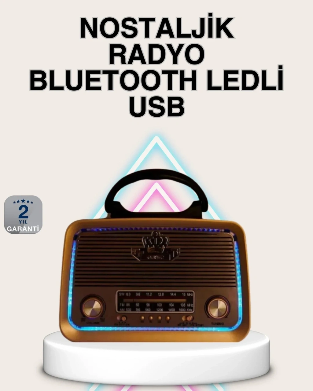 Ahşap kaplamalı Bluetooth nostalji radyo, klasik radyo tasarımını günümüz teknolojisiyle birleştirerek benzersiz bir kullanım deneyimi sunar. Eskitme görünümlü dış yüzeyi ve retro detayları ile bulunduğu ortama nostaljik bir hava katar. FM, AM ve SW bantları sayesinde yerel ve uluslararası radyo yayınlarını geniş frekans aralığında dinleme imkânı sağlar.Bluetooth kablosuz bağlantı özelliği sayesinde akıllı telefonlarınızdan müzik çalabilir, USB bellek ve SD kart girişleriyle dijital müzik arşivinizi kolayca kullanabilirsiniz. AUX girişi sayesinde farklı ses kaynaklarını da bağlayabilirsiniz.Şarj edilebilir bataryası, kabloya bağlı kalmadan kullanım özgürlüğü sunar. 5 watt çıkış gücü, ev ve ofis kullanımı için yeterli ve dengeli bir ses sağlar. Kolay ayarlanabilir düğmeleri sayesinde herkes tarafından rahatlıkla kullanılabilir.Hem dekoratif hem fonksiyonel bir ürün arayanlar için ideal bir nostalji radyodur.