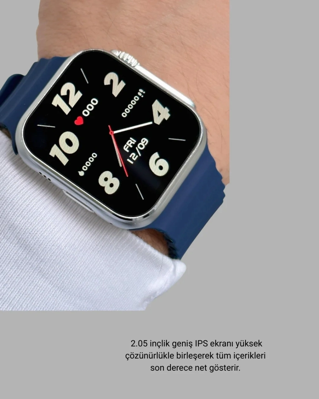 Bu akıllı saat, piyasada uygun fiyatıyla dikkat çeken en yeni Apple Watch Ultra klonlarından biri olup; teknoloji, tasarım ve fonksiyonelliği aynı anda sunan gelişmiş bir modeldir. 2,05 inç büyüklüğündeki geniş IPS ekranı sayesinde bildirimleri, menüleri ve spor modlarını yüksek çözünürlükle görüntüleyebilirsiniz. 420x480 piksel çözünürlüğü ve 2.5D kavisli cam yüzeyi, saate premium bir görünüm kazandırırken aynı zamanda daha net ve canlı renkler sunar.Saatin gövdesi dayanıklı çinko alaşımından, kayışı ise yumuşak ve ergonomik silikon malzemeden üretilmiştir. 49×40×10.7 mm ölçüleri ve yaklaşık 50 gramlık hafif yapısı sayesinde bilekte rahatsızlık oluşturmaz. Üç fonksiyonel yan tuş; menü geçişleri, geri dönüş ve hızlı erişim için oldukça pratik bir kullanım sağlar.IP67 su geçirmezlik sertifikasına sahip olan model, yağmur altında, elde yıkama esnasında ve günlük koşullarda güvenle kullanılabilir. 7/24 kalp atış hızı ölçümü, kandaki oksijen (SPO2) takibi, uyku analizi, tansiyon ölçümü gibi bir akıllı saatte bulunması gereken sağlık özelliklerinin tamamını sunar. Adım sayacı ve kalori hesaplama özelliği sayesinde gün boyu aktivitenizi kontrol edebilirsiniz.Bluetooth arama desteği, dahili hoparlör ve mikrofon ile doğrudan saat üzerinden arama yapabilir veya gelen çağrıları cevaplayabilirsiniz. Çoklu spor modları; yürüyüş, koşu, bisiklet, ip atlama ve daha birçok aktiviteyi takip eder. Ek özellikler arasında: telefon bulma, hava durumu, hareketsizlik uyarısı, termometre, Alipay offline ödeme, alarm, müzik kontrol gibi geniş bir fonksiyon listesi bulunur.360 mAh batarya kapasitesiyle 3-5 gün aktif kullanım, 7 güne kadar bekleme süresi sunarak şarj sıkıntısını ortadan kaldırır. Hem şık hem fonksiyonel hem de bütçe dostu bir akıllı saat arayanlar için mükemmel bir tercihtir.