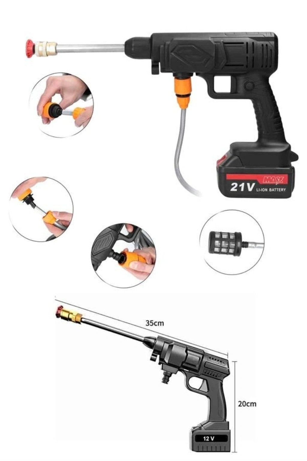 Taşınabilir Akülü Yıkama Makinesi - Güçlü Temizlik, Kolay Kullanım Güçlü performansı ve taşınabilirliğiyle dikkat çeken Akülü Yıkama Makinesi, evde ve dış mekanlarda temizlik ihtiyaçlarınızı hızlı ve verimli bir şekilde karşılamak için ideal bir çözümdür. 21V XR Li-Ion bataryası, kömürsüz motoru ve uzun süreli çalışma kapasitesi ile mükemmel temizlik sonuçları sunar. Bu cihaz, araba yıkamadan bahçe temizliğine kadar çeşitli temizlik işlemlerini kolayca gerçekleştirmenizi sağlar.Etkili Temizlik ve Güçlü Performans1500mAh aküsü ve 5 pilli dahili bataryası ile uzun süreli kullanım sağlar. 1.7 Mpa'lık yüksek tepe basıncı, en inatçı kirleri bile rahatlıkla temizlemenize olanak tanır. 3.2 L/dak su çıkışı sayesinde, her kullanımda etkili ve hızlı temizlik sağlarsınız. Metal pompa silindiri, uzun ömürlü ve dayanıklı bir kullanım için tasarlanmıştır, böylece cihaz uzun süre performans kaybı yaşamaz.Hızlı Şarj ve Kolay Kullanım60 dakikalık hızlı şarj süresi ile her zaman kullanıma hazırdır. 2 kg'lık hafif tasarımı, taşımasını ve yönlendirilmesini son derece kolaylaştırır. Ergonomik yapısı sayesinde her yaştan kullanıcı tarafından rahatlıkla kullanılabilir. Araba yıkama, bisiklet temizliği veya evde bahçe sulama gibi farklı kullanım alanlarında da size büyük kolaylık sağlar.Dayanıklı ve Uzun Süreli KullanımÜrün, 2 yıl garanti süresiyle birlikte gelir, böylece uzun vadeli kullanımda güvenli bir deneyim sunar. Hafif yapısı, güçlü performansı ve yüksek dayanıklılığı ile her türlü temizlik işinizi zahmetsizce tamamlamanızı sağlar. Hem evde hem de dış mekanlarda kullanım için mükemmel bir tercihtir.