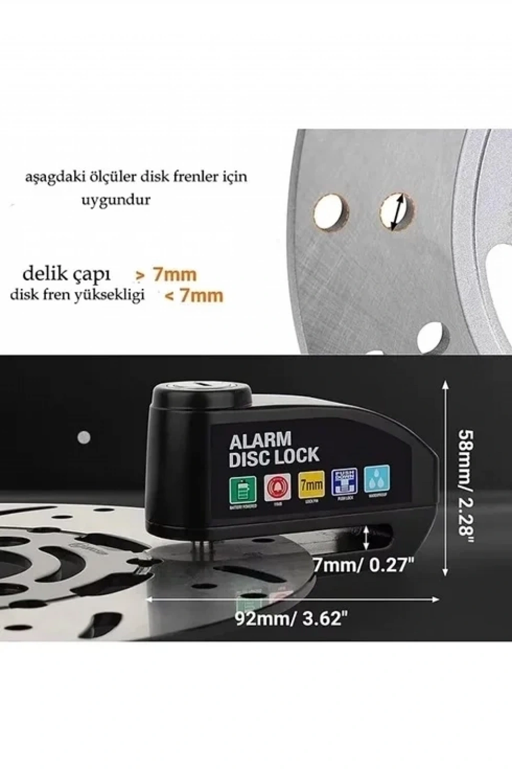 YÜKSEK SES DESİBELİ ILK HAREKETTE 3 KEZ SESLI IKAZ VEREREK UYARIR HAREKET EDEVAM EDERSE 45 SN BOYUNCA SUREKLI SESLI IKAZ VERIR HAREKET DURURSA OTOMATIK OLARAK KENDINI KAPATIR VE HAZIR BEKLER EĞER HAREKET DEVAM ETTIRILIYORSA SÜREKLİ SESLİ İKAZ VERMEYE DEVAM EDER PİL İLE ÇALIŞIR EĞER BIR SÜRE KULLANIMDAN SONRA DİSK KILIDINIZDEN Tİ-SÜREKLİ VE TİZ BİR ALARM SESİ GELİYORSA PİLLERİ BİTMİŞ DEMEKTİR İÇERİĞİNDE ÇIKAN ALLEN ANAHTAR ILE ALARM UZERINDEKI VIDALARI SOKUN PİL YATAGINI GÖRECEKSINIZ PILLERI DEĞİŞTİRİN ÇALIŞMAYA DEVAM EDECEKTİR Genel Bakış Ürünü rapor et • 110db yüksek sesli uyarı hatırlatıcısı :Alarm kilidi 110db yüksek sesli bir uyarı sesi üretir, bu da hırsızların dikkat çekmeden kilidi kırmasını veya kesmesini zorlaştırır.