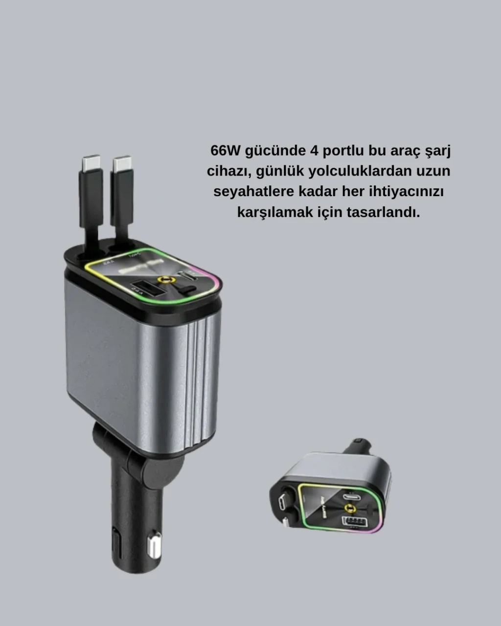 Yolda geçirdiğiniz zamanı daha verimli hale getirin! Araç Şarj Cihazı 66W 4 Portlu Hızlı Şarj ve LED Işıklı, güçlü performansı ve modern tasarımıyla araç içi şarj deneyimini yeniden tanımlıyor.66W toplam güç çıkışı ile aynı anda dört cihazınızı yüksek hızda şarj edebilir, telefon, tablet, akıllı saat veya kulaklıklarınızı güvenle enerjiyle buluşturabilirsiniz.PD (Power Delivery) ve QC (Quick Charge) teknolojileri sayesinde cihazlarınıza en uygun akımı otomatik olarak iletir, böylece pil sağlığını korurken hızlı şarj imkânı sunar.Çekilebilir kablo tasarımı (80 cm’ye kadar uzayabilir) sayesinde kablo karmaşasına son verir ve aracınızda düzenli bir görünüm sağlar.180 derece dönebilen başlık, farklı araç modellerine ve priz konumlarına uyum sağlar. Sallantılarda gevşeme yapmaz, sabit ve güvenli bir bağlantı sunar.LED atmosfer ışıkları, sadece es bir görünüm kazandırmakla kalmaz, aynı zamanda gece sürüşlerinde kullanım kolaylığı sağlar.12V-24V geniş uyumluluk özelliği sayesinde otomobil, SUV, minibüs ve kamyonlarda kullanılabilir. Kompakt ve dayanıklı yapısı uzun ömürlü kullanım sunar.Şık tasarımı, yüksek performansı ve pratik özellikleriyle Araç Şarj Cihazı 66W 4 Portlu Hızlı Şarj ve LED Işıklı, her yolculukta vazgeçilmez bir yardımcıdır!