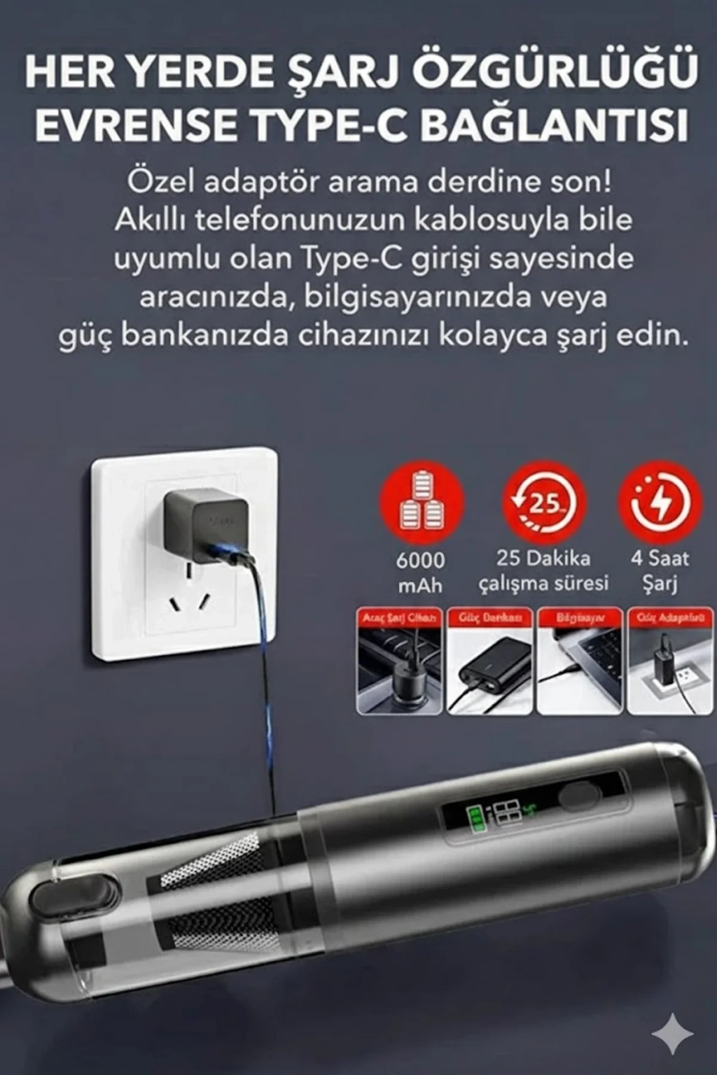 • Araç Süpürgesi Şarjlı 120w 20.000pa Göstergeli Yeni Nesil Metal Filtre Extra Vakum Ve Üfleme