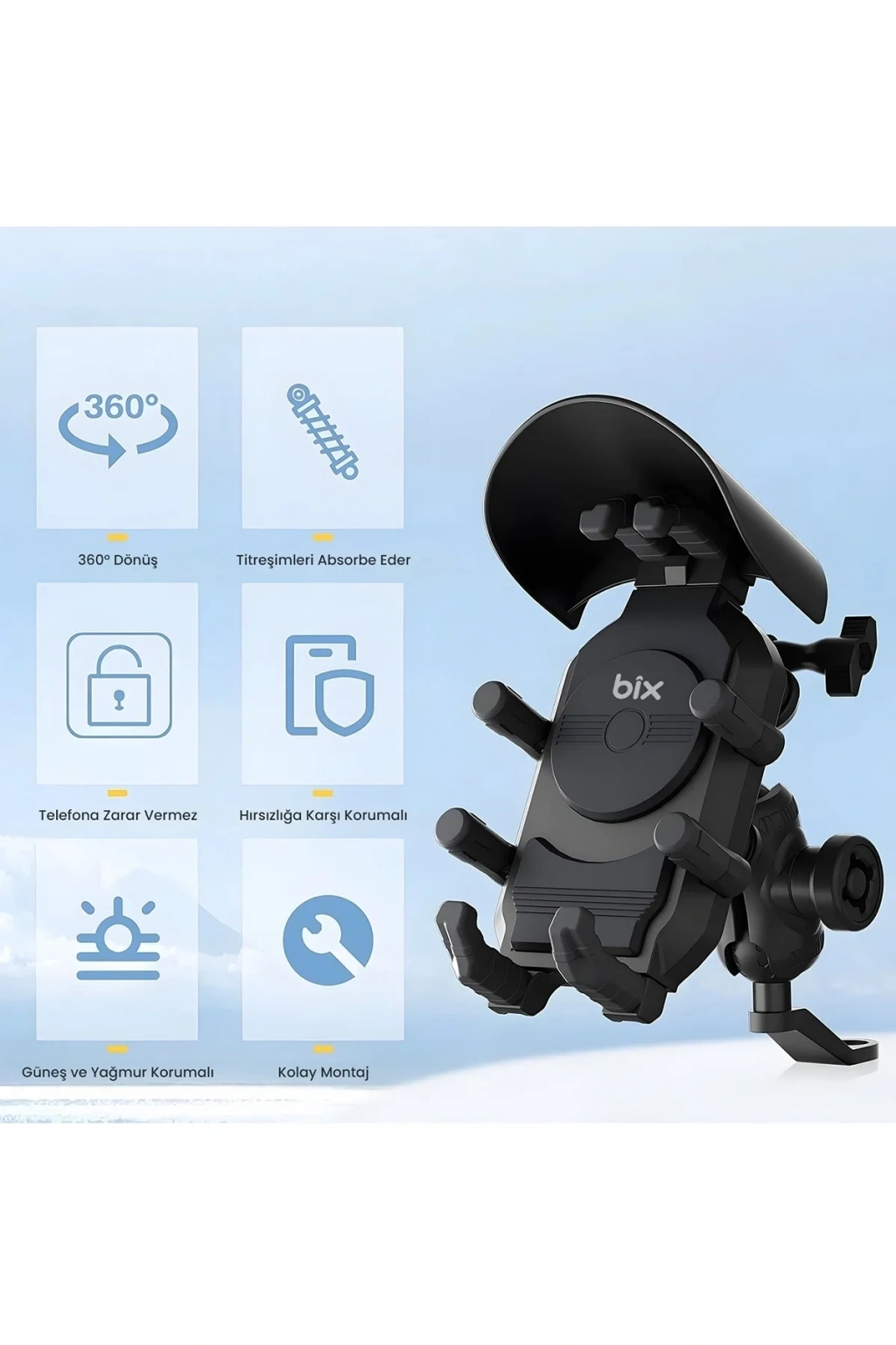 Ayna Bağlantılı Güneş ve Yağmur Korumalı 360° Derece Ayarlanabilir Motosiklet Telefon Tutucu