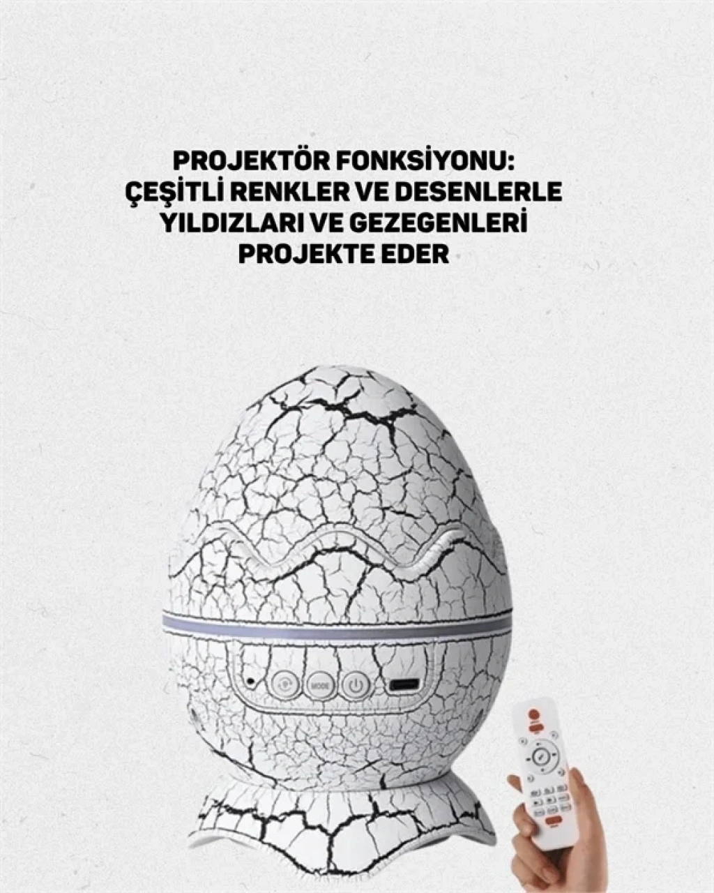 Bu çok amaçlı gece lambası, dikkat çekici dinozor yumurtası tasarımı ile es bir görünüm sunarken, işlevsel yapısıyla yaşam alanlarına değer katar. Ürün, 13.5 × 13.5 × 18 cm boyutlarındadır ve yalnızca 402 gram ağırlığındadır. ABS ve PVC malzemeden üretilmiş olup hem hafif hem dayanıklıdır. 5V 1A USB kablosu (1 metre) ile şarj edilebilir. Yüksek kaliteli COB LED’lerle donatılan projektör; beyaz, mavi, kırmızı gibi 7 farklı renk seçeneği sunar. Çocuk odası, oturma odası veya yatak odasında kullanıma uygundur.