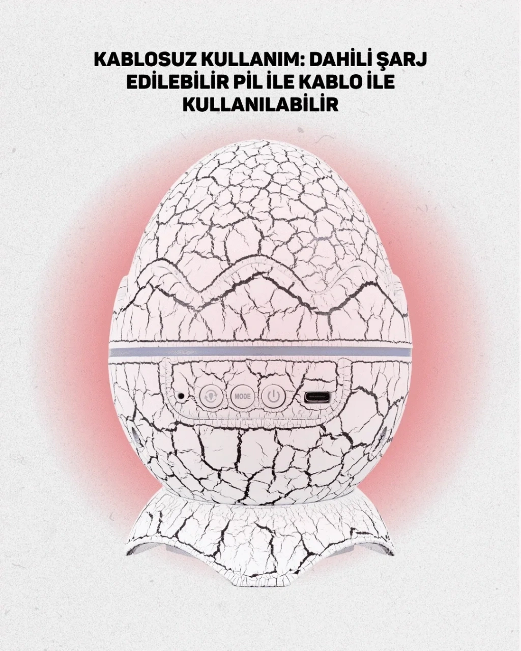 Bu çok amaçlı gece lambası, dikkat çekici dinozor yumurtası tasarımı ile es bir görünüm sunarken, işlevsel yapısıyla yaşam alanlarına değer katar. Ürün, 13.5 × 13.5 × 18 cm boyutlarındadır ve yalnızca 402 gram ağırlığındadır. ABS ve PVC malzemeden üretilmiş olup hem hafif hem dayanıklıdır. 5V 1A USB kablosu (1 metre) ile şarj edilebilir. Yüksek kaliteli COB LED’lerle donatılan projektör; beyaz, mavi, kırmızı gibi 7 farklı renk seçeneği sunar. Çocuk odası, oturma odası veya yatak odasında kullanıma uygundur.