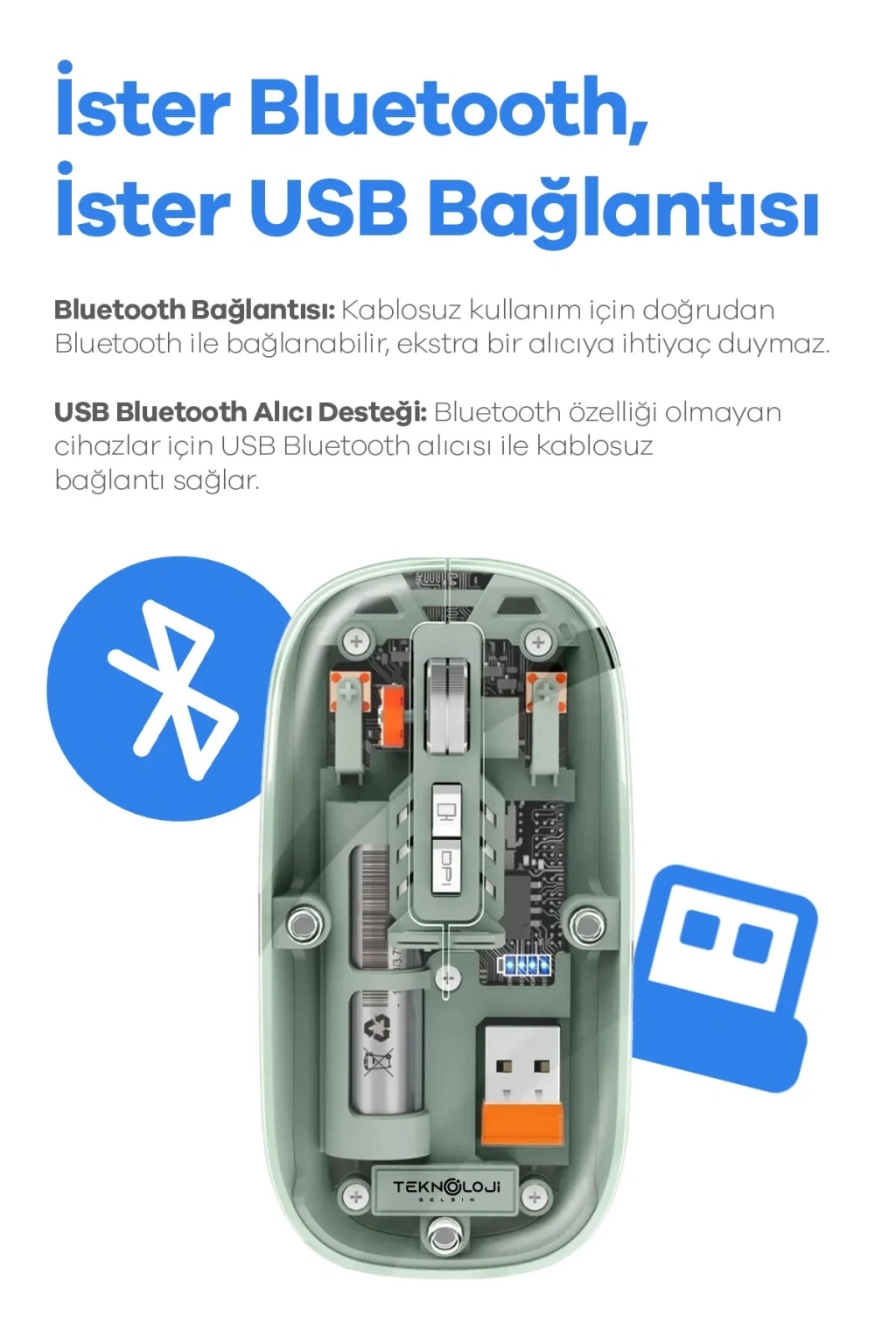 Hem Bluetooth hem de USB alıcı üzerinden bağlantı kurabilir. Böylece farklı cihazlar arasında kolay geçiş yapılabilir.