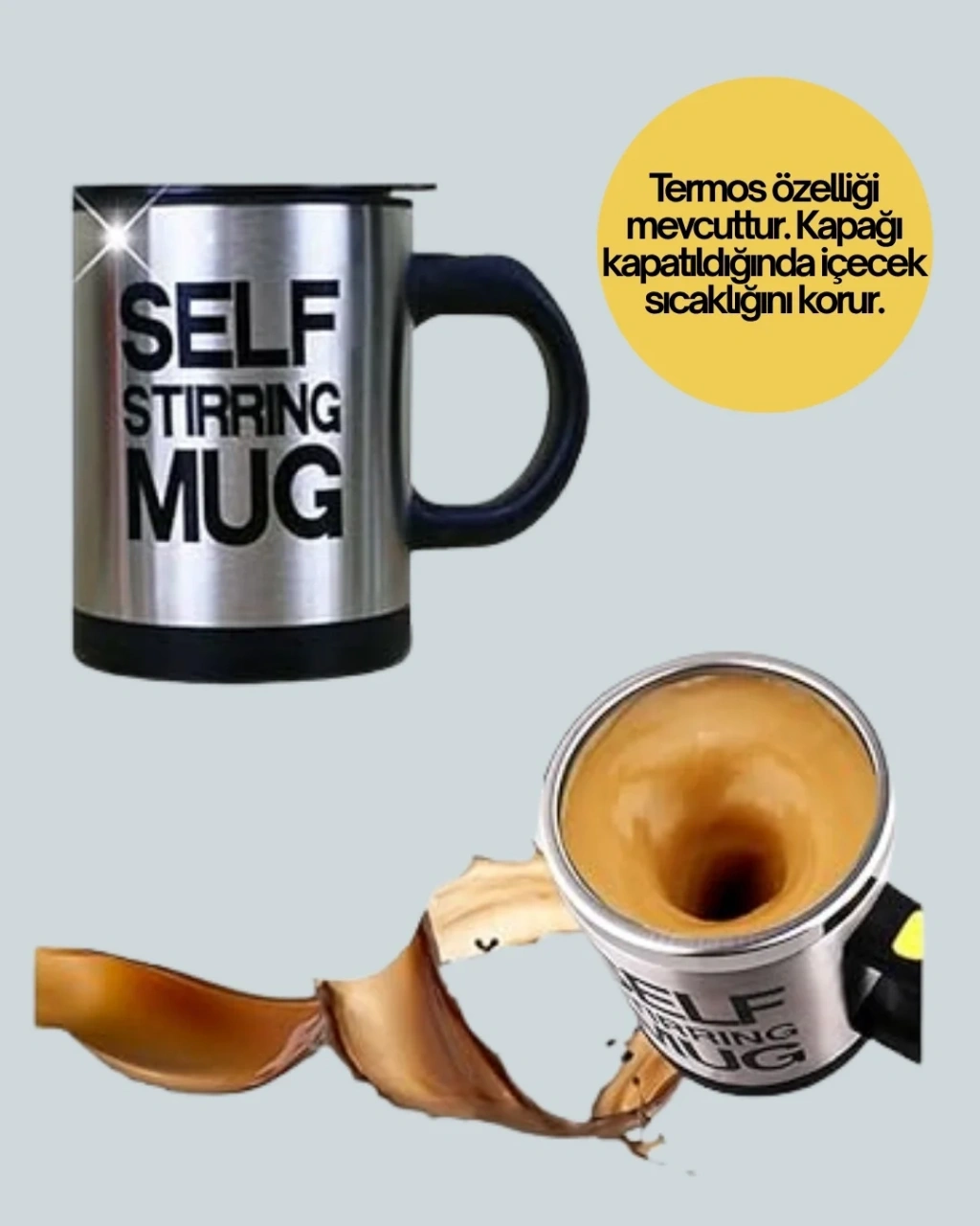 Kendi kendini karıştıran termos kupa, kahve ve diğer toz içeceklerin hazırlanmasını zahmetsiz hale getiriyor. İçerisindeki güçlü ve sessiz motor, mini pervane yardımıyla içeceğinizi saniyeler içinde karıştırır. Düğmeye basmanız yeterlidir; böylece kaşık veya çubuk kullanmanıza gerek kalmaz. Çift katmanlı termos yapısı, içeceğinizi uzun süre sıcak tutar ve dış yüzeyin ısınmasını engeller. Kompakt, hafif ve ergonomik tasarımı sayesinde ofiste, evde ya da seyahatte kullanıma uygundur. Kupanın dayanıklı yapısı, uzun yıllar sorunsuz performans sunar. Hem pratik hem şık bir içecek deneyimi isteyenler için vazgeçilmez bir yardımcıdır.