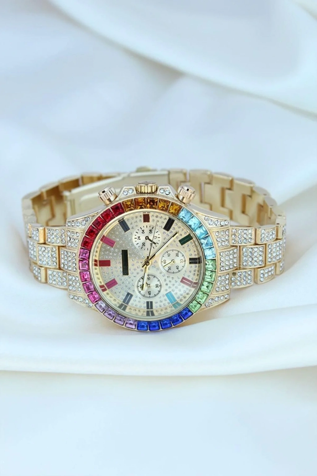 Clariss Trend Gold Metal Kordonlu Zirkon Taş Kaplama Renkli Taşlı Kasa Tasarımlı Lüx Kadın Kol Saati