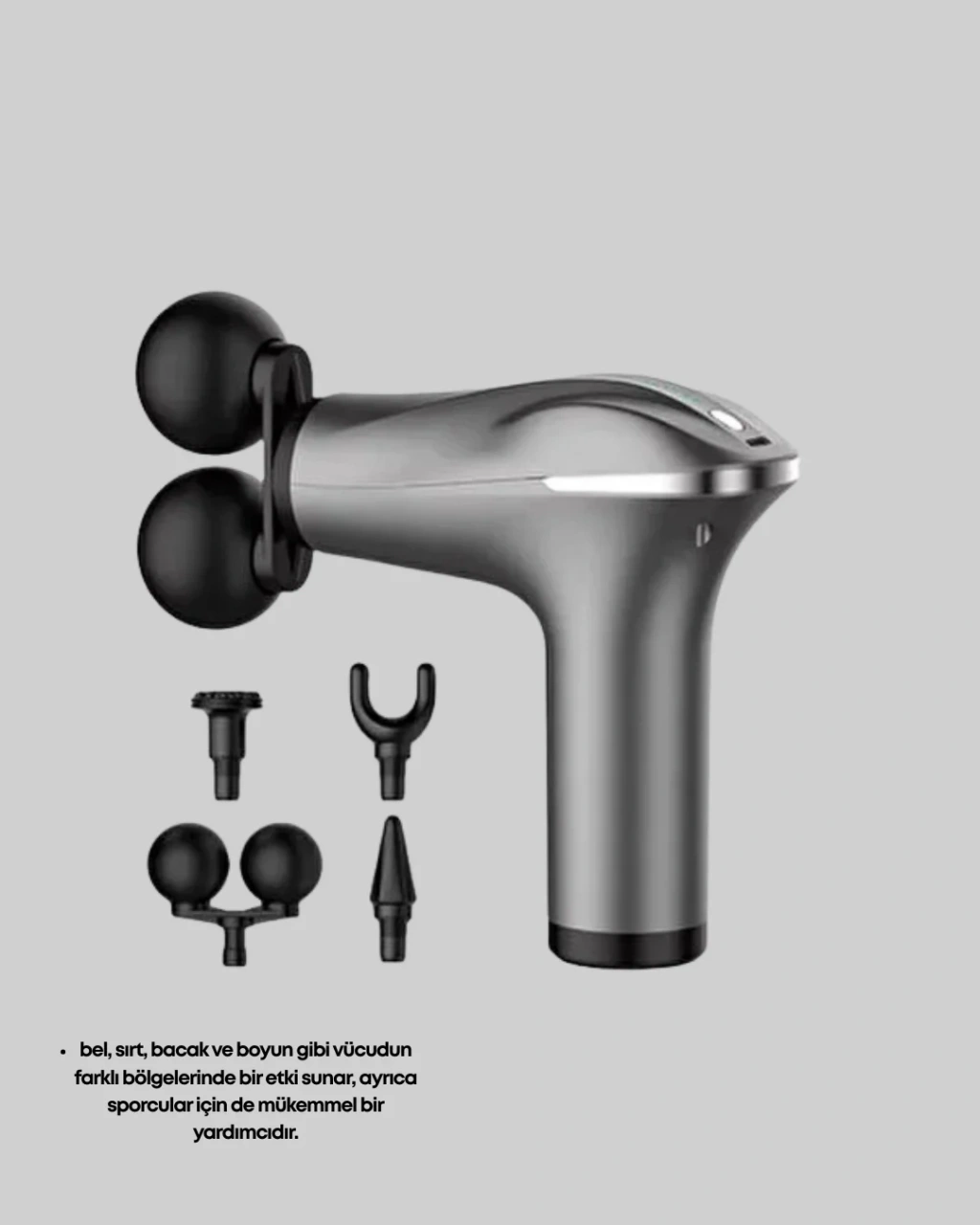 Bu titreşimli masaj tabancası, kompakt ve taşınabilir yapısıyla günlük yaşamda hızlı ve etkili bir masaj deneyimi sunmak için tasarlanmıştır. Özellikle bel, sırt, boyun ve bacak gibi bölgelerde oluşan gerginliği azaltmada oldukça etkilidir. Güçlü titreşim motoru, kaslara derinlemesine ulaşarak rahatlama sağlar ve spor sonrası toparlanma sürecine katkıda bulunur.Ürün dört masaj başlığı içerir. Başlıklar, vücuttaki farklı kas gruplarına özel olarak geliştirilmiştir. Geniş yüzeyli başlık, büyük kas gruplarında etkili kullanılırken daha küçük başlıklar hassas noktalarda ideal performans sunar.Cihazın şarjlı yapısı sayesinde masaj sırasında kablo kısıtlaması yaşamazsınız. Taşınabilir bir ürün olduğu için evde, sporda veya seyahatte çantanıza atıp her an yanınızda taşıyabilirsiniz. Ergonomik tasarımı, cihazı elinizde dengeli ve rahat bir şekilde kullanmanızı sağlar.Masaj tabancasındaki çoklu hız ayarı, farklı ihtiyaçlara göre masaj yoğunluğunu ayarlanabilir hale getirir. Hafif bir kas rahatlaması ya da daha derin bir masaj uygulamak mümkün olur.Kas yorgunluğunu azaltmak, stresi hafifletmek ve gün içinde daha enerjik hissetmek isteyen kullanıcılar için ideal bir tercihtir. Özellikle sporcular için antrenman sonrası kasların toparlanmasına destek sağlayan etkili bir cihazdır.Şarj edilebilir bataryası uzun kullanım süresi sunar ve kullanıcıya kesintisiz bir masaj deneyimi sağlar. Sade ve modern tasarım detayları ile hem fonksiyonel hem es bir kullanım sunar.Bu masaj tabancası, günlük yaşamda kolaylıkla kullanılabilecek pratik bir masaj çözümü arayan herkes için mükemmel bir üründür.