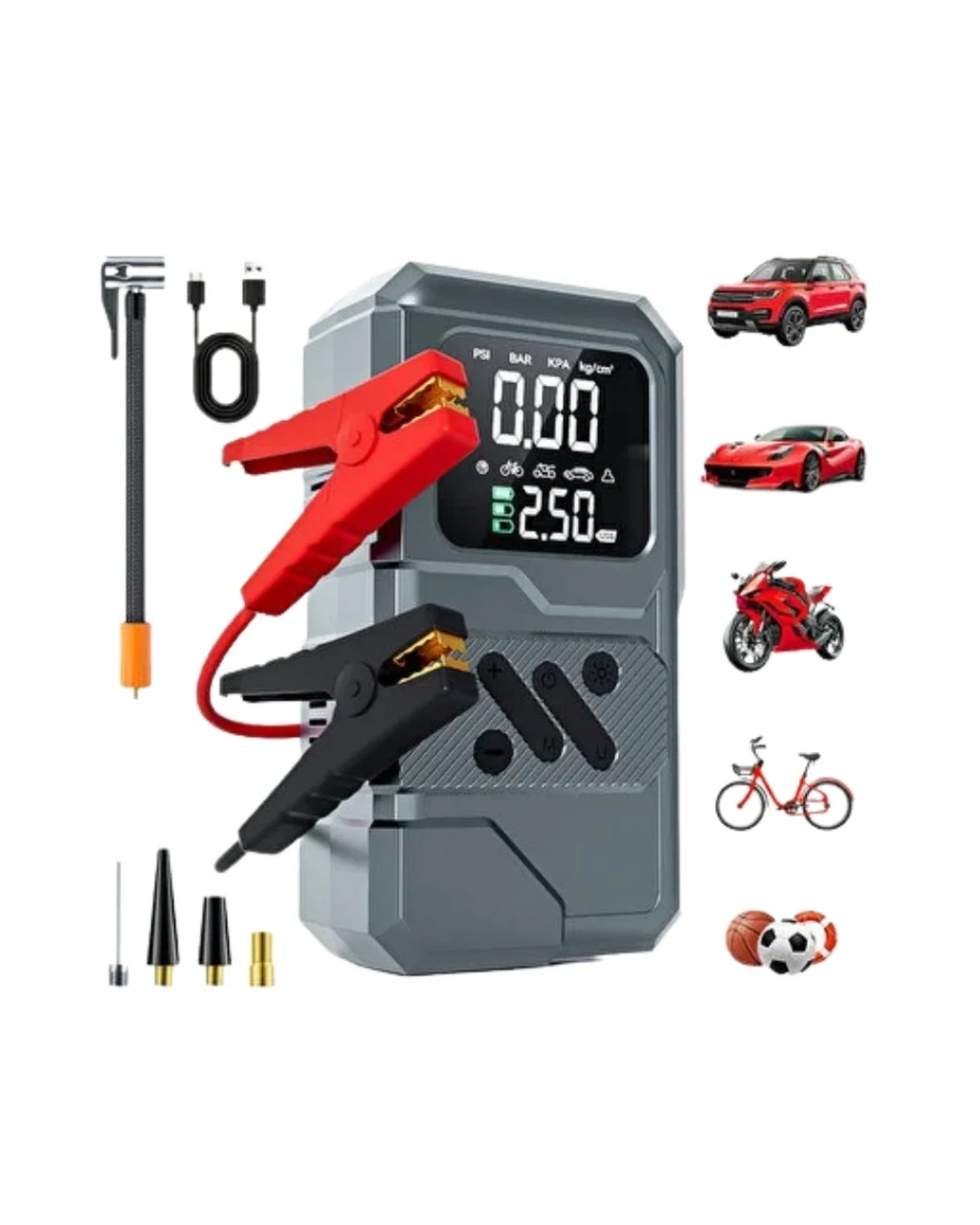 Araç kullanıcılarının yolda karşılaşabileceği beklenmedik durumlar göz önünde bulundurularak tasarlanan bu çok fonksiyonlu cihaz, pratikliği ve çok yönlü kullanımıyla öne çıkar. Akü takviye, lastik şişirme, aydınlatma ve powerbank özelliklerini tek bir gövdede birleştirmesi sayesinde araç içerisinde ayrı ayrı ekipman taşıma ihtiyacını ortadan kaldırır. 12.000 mAh kapasiteli dahili bataryası, günlük kullanımda ve acil durumlarda yeterli enerji desteği sunar.Akü takviye fonksiyonu, 12V araç sistemleriyle uyumlu olacak şekilde geliştirilmiştir. Uzun süre park halinde kalan veya soğuk havalarda aküsü zayıflayan araçlar için destekleyici bir çözüm sunar. Kullanımı pratik olan bu özellik, sürücünün yolda kalma riskini azaltmaya yardımcı olur. Lastik şişirme özelliği ise dijital hava kompresörü ile desteklenmiştir. Basınç değerlerinin ekrandan takip edilebilmesi, lastiklerin ideal seviyede şişirilmesini kolaylaştırır ve güvenli sürüşe katkı sağlar.LED aydınlatma sistemi, gece kullanımı ve düşük ışıklı ortamlarda büyük bir avantaj sunar. Yol kenarında yapılan müdahalelerde ortamın aydınlatılmasına yardımcı olurken, acil durumlarda görünürlüğü artırır. Powerbank fonksiyonu sayesinde telefon, navigasyon cihazı ve diğer elektronik ürünler USB çıkışı üzerinden şarj edilebilir. Bu özellik, özellikle uzun yolculuklarda ve elektrik erişiminin sınırlı olduğu durumlarda oldukça kullanışlıdır.Kompakt ve dayanıklı gövde yapısı sayesinde araç içerisinde rahatça taşınabilir. Taşıma kesesi ile düzenli bir saklama imkânı sunar. Araçta, evde veya seyahatlerde kullanıma uygun olan bu ürün, çok yönlü yapısıyla hem bireysel kullanıcılar hem de sık seyahat edenler için ideal bir yardımcıdır.