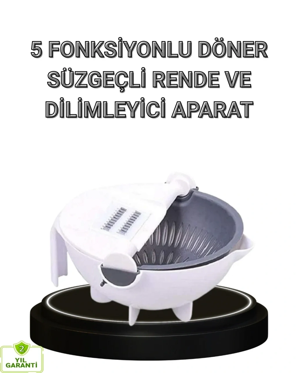 Mutfakta işlerinizi hızlandırmak ve çok daha düzenli bir çalışma alanı oluşturmak istiyorsanız, 5 Fonksiyonlu Döner Süzgeçli Rende tam size göre bir üründür. Hem profesyonel mutfaklarda hem ev kullanıcılarında tercih edilen bu cihaz, birçok işlemi tek üründe birleştirerek büyük kolaylık sunar.Döner mekanizması, farklı kesim bıçaklarını anında değiştirmenize imkân tanır. Böylece tek bir cihazla hem ince hem kalın rendeleme, hem şerit kesme hem de yuvarlak dilimleme yapabilirsiniz. Bu özellik, özellikle yemek hazırlığı sırasında zaman kaybını önler ve mutfakta daha verimli çalışmanıza yardımcı olur.Hazne kısmı, doğranan yiyeceklerin dağınıklık oluşturmamasını sağlar. Ayrıca bu hazne süzgeç görevi de görür; sebzeleri doğradıktan sonra hemen su altında yıkayabilir ve pratik şekilde süzebilirsiniz. Bu çift fonksiyon, mutfakta kullanılan araç sayısını azaltarak işlerinizi kolaylaştırır.Kullanım güvenliği için tasarlanmış kaymaz taban, ürünün sabit durmasını sağlar ve işlem sırasında kaymasını engeller. El koruma atı ise bıçaklara yakın çalışırken maksimum güvenlik sunar. Bu sayede olası kesiklerin önüne geçilir.Ürünün kompakt tasarımı yer kaplamaz ve saklamayı kolaylaştırır. Parçalarının kolayca ayrılabilir olması, temizlik sürecini oldukça pratik hale getirir. İster elinizde yıkayın ister su altında durulayın, hijyenik kullanım her zaman mümkündür.Paslanmaz çelik bıçakları uzun süre keskinliğini korur ve yüksek performans sunar. Sağlam plastik gövde, gıda ile temasa uygun yapıda olup sağlıklı bir kullanım sağlar. Ürün, salata hazırlama, sebze doğrama, sos hazırlama, garnitür kesme ve daha birçok mutfak işleminde hızlı bir yardımcıdır.Bu 5 fonksiyonlu döner rende, mutfakta pratiklik ve düzen arayan herkes için vazgeçilmez bir araçtır.