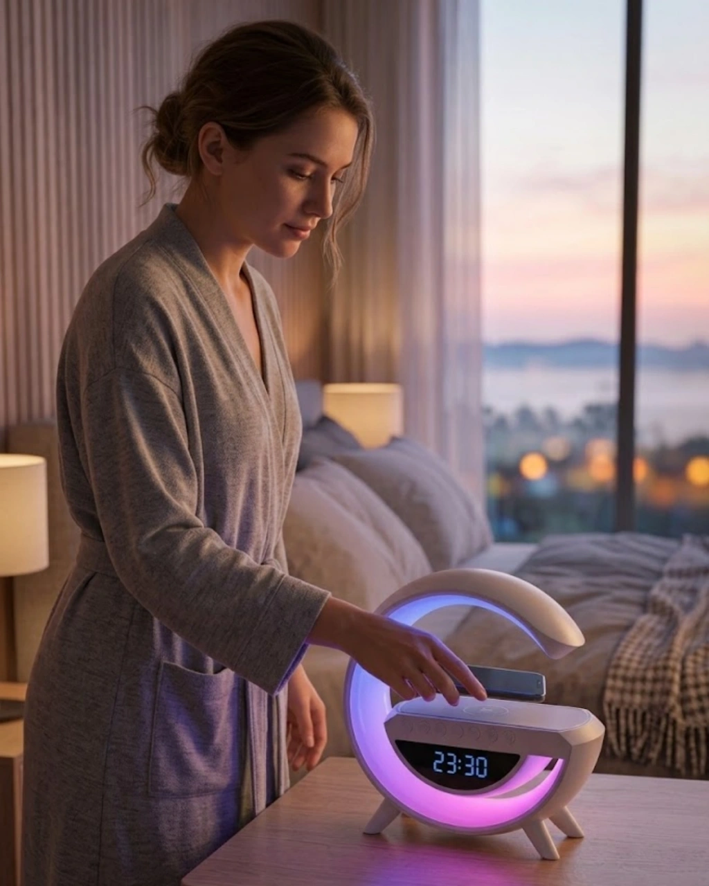 Bu çok fonksiyonlu cihaz, teknolojiyi ve konforu bir araya getirerek kullanıcılarına benzersiz bir deneyim sunar. Kablosuz şarj özelliği ile telefonunuzu kolayca şarj edebilir, Bluetooth hoparlör ile müzik keyfi yaşayabilirsiniz.RGB ışık özelliği sayesinde ortamınıza farklı bir atmosfer katabilirsiniz. Renk geçişleri ile es bir görünüm sunar ve gece lambası olarak kullanılabilir.Dijital saat ve alarm özelliği ile günlük planlarınızı düzenleyebilirsiniz. Kullanımı oldukça basittir ve her yaş grubuna hitap eder.Minimal tasarımı sayesinde her ortama uyum sağlar.