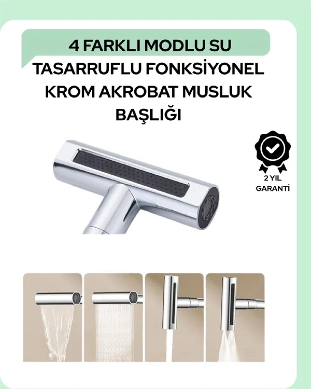 Mutfakta, banyoda ya da ofiste su kullanımı artık çok daha pratik! 4'ü 1 arada musluk başlığı; yağmur, şelale, sprey ve kabarcık olmak üzere dört farklı su akışı moduyla günlük su ihtiyaçlarınıza göre özelleştirilmiş çözümler sunar. Tek kollu ergonomik tasarımı sayesinde 360 derece döner, lavabonun her alanına kolayca yönlendirilir. ABS ve pirinçten üretilen sağlam gövdesiyle uzun ömürlü kullanım sağlarken, su tasarrufu da yapmanıza yardımcı olur. Kolay montaj için gereken adaptör seti ürünle birlikte gelir. Şık ve fırçalanmış krom kaplama sayesinde dekoratif görünüm sunar. Modern evler için akıllı bir çözüm!