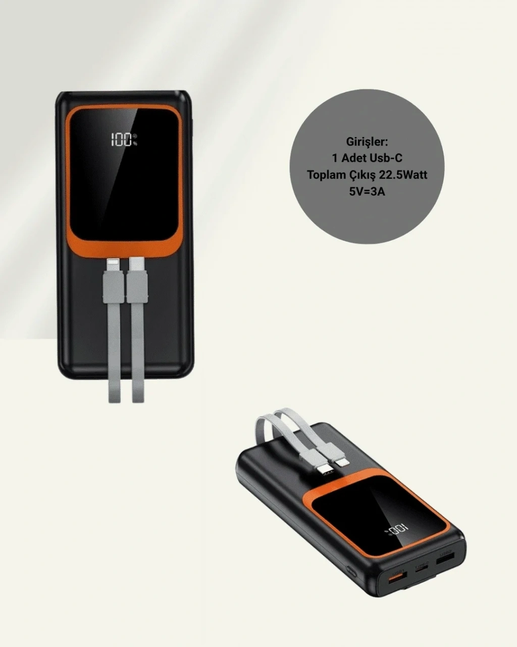 Üzerindeki LED dijital ekran sayesinde kalan pil yüzdesini net olarak takip edebilirsiniz. Ayrıca dahili çoklu kablolar (Type-C, Lightning, Micro USB) sayesinde tüm cihazlarla uyumlu çalışır. Kablo taşıma derdi olmadan kolay kullanım sağlar.