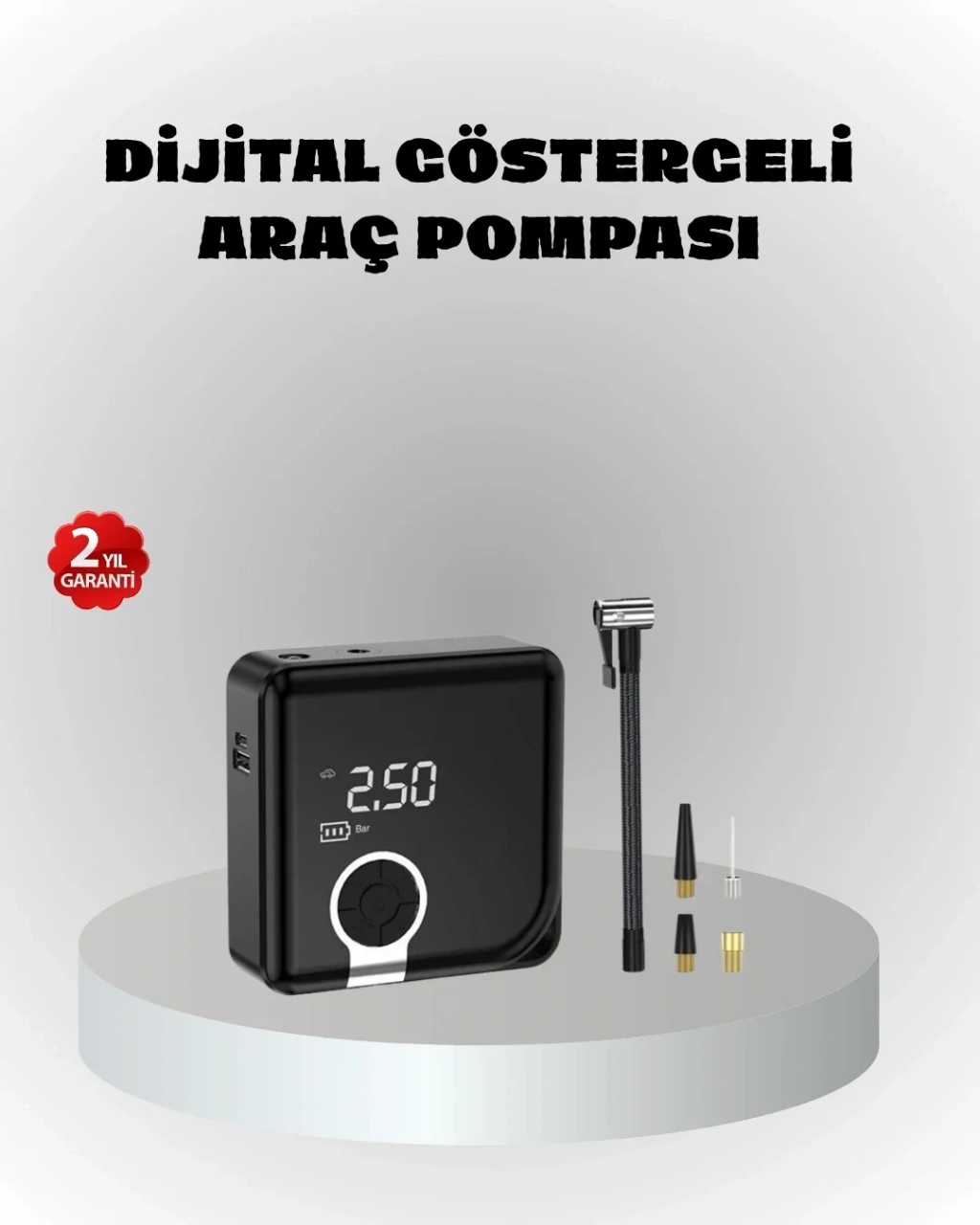Taşınabilir Şarjlı Akıllı Hava Kompresörü, ihtiyaç duyduğunuz her an hızlı ve güçlü performans sağlayan yenilikçi bir hava basınç cihazıdır. 150 PSI’a kadar ulaşan yüksek basınç kapasitesi ile otomobil, motosiklet ve bisiklet lastiklerinin yanı sıra spor topları, deniz ürünleri, şişme yataklar ve kamp ekipmanları gibi birçok ürünü şişirmeye uygundur. Kompakt yapısı sayesinde aracınızda, evde ya da çantanızda kolayca yer kaplar.Dijital ekranı üzerinden basıncı net bir şekilde takip edebilir, istediğiniz değeri hassasiyeti yüksek kontrol sistemi ile ayarlayabilirsiniz. Akıllı otomatik kapanma özelliği sayesinde cihaz, önceden belirlenen basınca ulaştığında kendiliğinden durur. Bu durum hem lastiğin fazla şişmesini engeller hem de cihazın uzun ömürlü kullanımına katkı sağlar.6000 mAh batarya kapasitesi, cihazın tek şarjla dört lastiği şişirebilmesini mümkün kılar. Type-C hızlı şarj özellikli olması, modern cihazlarla uyumlu kullanım sağlar. İhtiyaç halinde powerbank ile bile şarj edilebilmesi sayesinde her ortamda çalıştırabilirsiniz. Ayrıca cihazın üzerinde yer alan LED aydınlatma ve SOS ışığı, özellikle gece yolculuklarında hayat kurtarıcı bir detay olarak öne çıkar.Kompresörün güçlü motoru sessiz ve stabil çalışır. Titreşim azaltıcı gövde tasarımı sayesinde kullanım sırasında konfor sağlar. Aynı zamanda ergonomik tutuşu ile elinizde kolayca kavrayabilir ve uzun süre rahatlıkla kullanabilirsiniz. Dayanıklı malzemelerden üretilmiş gövdesi, darbeye ve dış etkenlere karşı koruma sağlar. Spor, kamp, seyahat ve günlük kullanım için ideal olan bu ürün, pratikliği ve performansıyla beklentileri fazlasıyla karşılar.