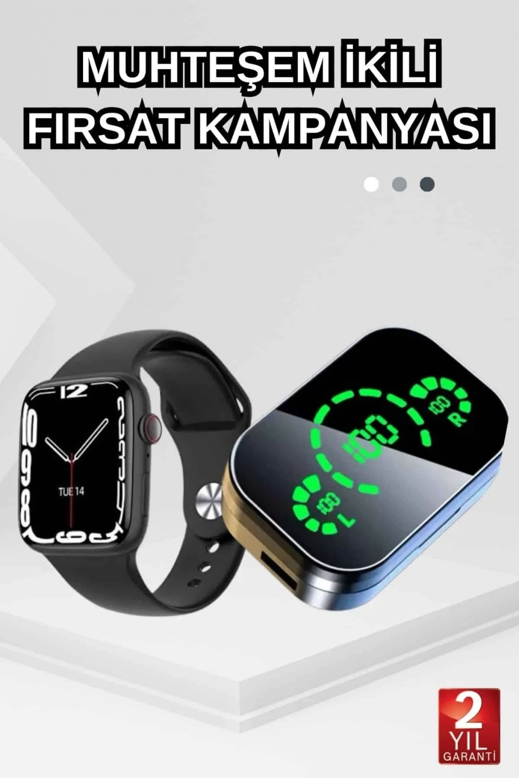 KULAKLIK:Dokunmatik kontrol özelliği sayesinde müziklerinizi ve çağrılarınızı kolayca yönetebilirsiniz. Dahili mikrofonu ile net görüşmeler yak, eller serbest deneyiminin keyfini çıkarın. Suya ve tere karşı dayanıklı yapısı sayesinde, spor aktivitelerinizde veya yağmurlu havalarda rahatlıkla kullanabilirsiniz. Çift telefon desteği ile iki cihaz arasında kesintisiz geçiş yak, bağlantıda kalın. Aktif gürültü engelleme (ANC) teknolojisi ile dış dünyanın gürültüsünü filtreleyerek, müziğinize tam odaklanabilirsiniz.AKILLI SAAT:Bu akıllı saat, modern teknoloji ile günlük hayatınızı kolaylaştıracak özellikleri bir araya getiren yenilikçi bir cihazdır. Tüm iOS ve Android akıllı telefonlarla uyumlu olan bu saat, geniş bir kullanıcı kitlesine hitap eder. Siri sesli asistan desteği sayesinde sesli komutlarla işlemlerinizi hızlıca gerçekleştirebilirsiniz. Bluetooth bağlantısı aracılığıyla çağrı yapma, çağrılara cevap verme veya reddetme, sık görüşülenler listesini yönetme, çağrı geçmişini görüntüleme ve arayan kimliğini görme gibi birçok özelliği destekler. Ayrıca, SMS ve diğer uygulamalardan gelen bildirimleri görüntüleme ve okuma imkanı sunar.44 mm paslanmaz çelik kasası, dayanıklılığı ve şıklığı bir arada sunar. 240x285 piksel çözünürlükteki, köşeden köşeye tam gelişmiş dokunmatik OLED ekranı, parlak ve net bir görüntü deneyimi sağlar. 280 mAh Li-Po bataryası, uzun süreli kullanım sunarak gün boyu yanınızda olmasını garanti eder. 128 MB bellek kapasitesi ve aktif iki yan tuşuyla kullanıcı dostu bir arayüz sunar.Sağlık ve spor odaklı özellikleriyle öne çıkan bu cihaz, günlük aktivitelerinizi ve sağlık durumunuzu takip etmenize yardımcı olur. Pedometre özelliğiyle egzersiz süresi, kat edilen mesafe ve yakılan kalori gibi verilere ulaşabilirsiniz. EKG, kan basıncı, tansiyon ölçümü ve kandaki oksijen oranını ölçme gibi üçlü sağlık takibi özellikleri sayesinde sağlığınızı yakından izleyebilirsiniz. Uyku takibi, hava durumu, kronometre, alarm, çağrı hatırlatma, hareketsizlik ve su içme hatırlatmaları gibi işlevlerle hayatınızı kolaylaştırır.Spor severler için, koşu, bisiklet, kuvvet antrenmanı, basketbol, tenis, voleybol ve futbol gibi çoklu spor modları sunar. Veri (DATA) sekmesi sayesinde günlük ve anlık sağlık verilerinizi analiz edebilirsiniz. Uygulama üzerinden sınırsız saat kadranı seçebilir ve ekranınıza dilediğiniz fotoğrafı yerleştirebilirsiniz. Akıllı bileklik hareket sensörü, ekranın kolayca açılıp kapanmasını sağlar.10 kişiye kadar hızlı arama özelliği, değiştirilebilir kordon seçeneği ve Türkçe dahil 23 farklı dil desteğiyle kişiselleştirilebilir bir deneyim sunar. Uçak modu ve rahatsız etme modu gibi işlevlerle kullanımınızı daha verimli hale getirebilirsiniz. Saat üzerinden müzik dinleme, uzaktan fotoğraf çekme gibi eğlenceli özellikler de cihazın dikkat çeken detayları arasındadır.Şıklığı, dayanıklılığı ve fonksiyonelliği bir araya getiren bu akıllı saat, hem teknoloji tutkunları hem de aktif bir yaşam tarzını benimseyen kullanıcılar için mükemmel bir tercihtir.