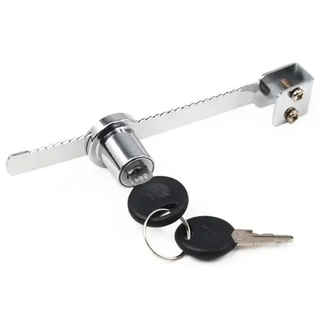Bu ürün, özellikle ecza dolapları ve ilan panolarında kullanılan kayar cam kilididir. Cam kapakların güvenli bir şekilde kilitlenmesi ve açılmasını sağlamak için tasarlanmış olan bu kilit, hem güvenlik hem de işlevsellik sunar.