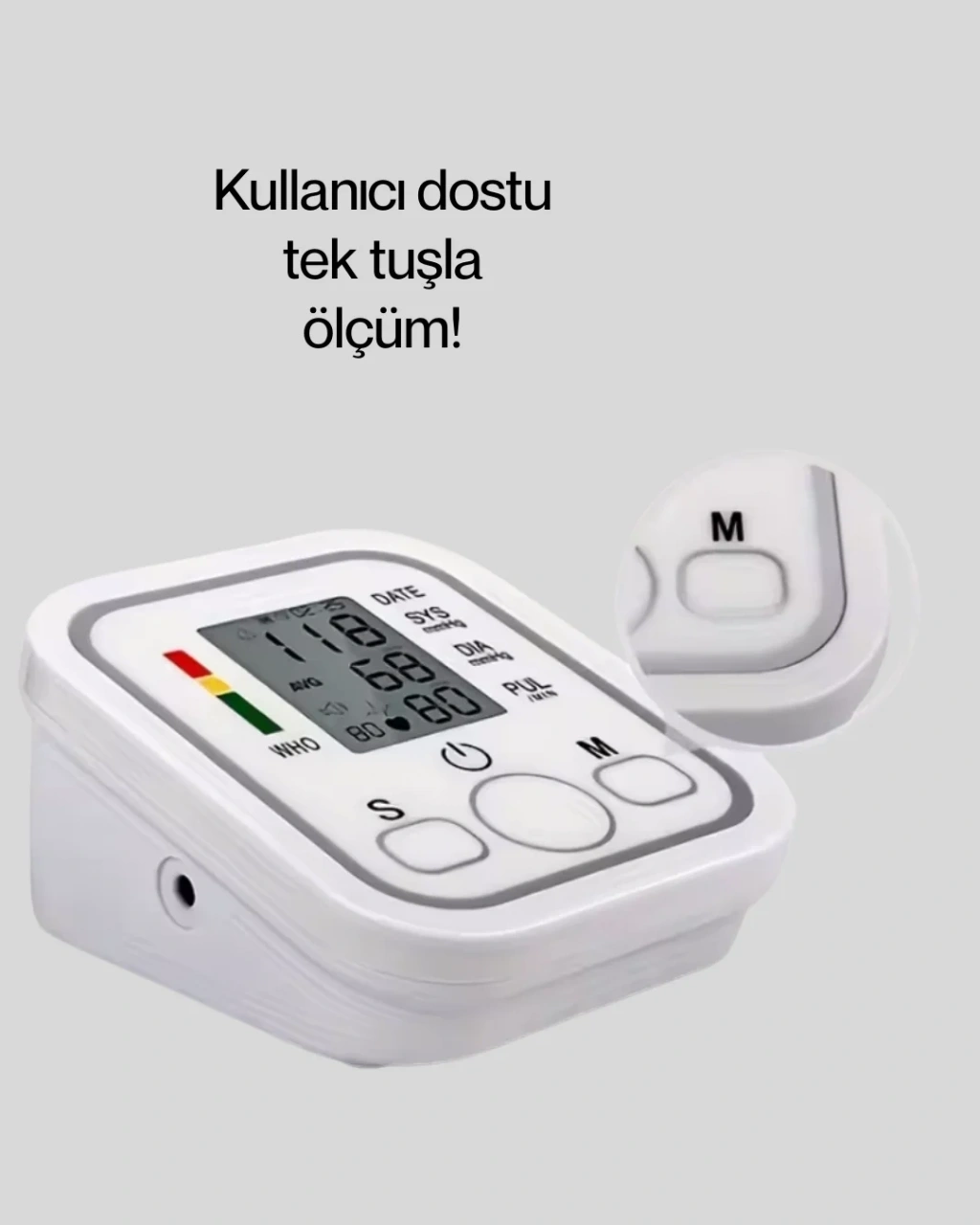 Sağlığınızı evinizde kolayca takip etmenizi sağlayan elektronik tansiyon ölçer, modern tasarımı ve yüksek hassasiyeti ile güvenilir sonuçlar sunar. IHB aritmi tespit özelliği sayesinde yalnızca tansiyonunuzu ölçmekle kalmaz, aynı zamanda düzensiz kalp atışlarını da algılayarak sağlığınız hakkında daha kapsamlı bilgiler verir. LCD dijital ekranı sayesinde ölçüm sonuçlarınızı büyük ve net bir şekilde görüntüleyebilirsiniz. Kan basıncı sınıflandırma sistemi (WHO standardı) ile sonuçlarınızı kolayca değerlendirip takip edebilirsiniz.Cihaz 2x99 hafıza kapasitesine sahiptir. Bu sayede hem kendi ölçümlerinizi hem de başka bir aile bireyinin ölçümlerini ayrı ayrı kayıt altında tutabilirsiniz. İki farklı ölçüm yöntemi (nabız tarama ve osilometri) sayesinde daha güvenilir ve hassas sonuçlar elde edilir. Hafif ve kompakt tasarımı ile taşınabilir yapıda olan cihaz, seyahatte ve günlük kullanımda büyük kolaylık sağlar. Güç kaynağı olarak 4xAAA pil veya Android uyumlu USB şarj kablosu kullanılabilir. Paket içerisinde tansiyon ölçüm bandajı, manuel ve monitör yer almaktadır. Sağlığınızı profesyonel bir şekilde takip etmek isteyen herkes için ideal bir üründür.