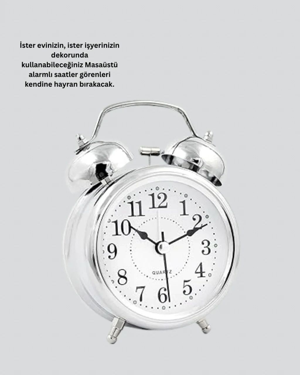 Hem es hem fonksiyonel bir masa saati arıyorsanız, Dekoratif Gümüş Masa Üstü Çalar Saat tam size göre! Parlak gümüş rengiyle ortama zarif bir ışıltı katarken, sessiz mekanizması sayesinde huzurlu bir atmosfer sağlar.Ürün, yüksek kaliteli metal ve plastik karışımı gövdesi ile uzun ömürlü kullanım sunar. Işıklı ekranı, karanlık ortamlarda bile saatin net biçimde görünmesini sağlar. Alarm fonksiyonu, güçlü sesiyle ağır uykulu kullanıcıları bile kolayca uyandırır.12 cm x 9 cm x 5 cm ölçülerindeki kompakt yapısı, yatak odası komodinlerinde, ofis masalarında veya raflarda kolayca konumlandırılabilir. 1 adet AA pil ile çalışır (pil pakete dahil değildir).Sade ama dikkat çekici tasarımıyla her ortama uyum sağlar. Hem dekoratif hem de pratik bir ürün arayanlar için mükemmel bir seçimdir. Ayrıca doğum günü, yeni ev hediyesi veya ofis hediyesi olarak da şık bir alternatiftir.