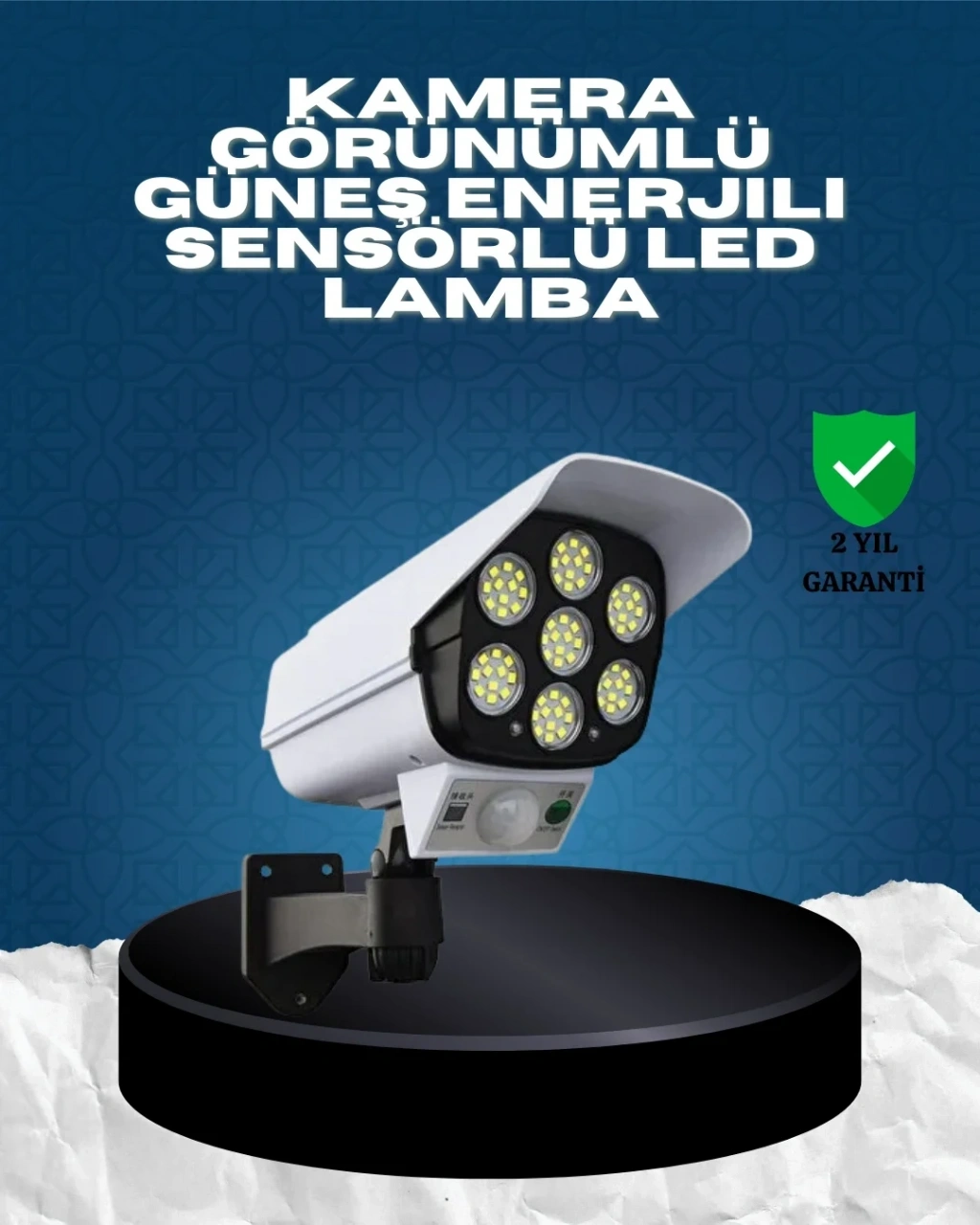 Güvenlik ve aydınlatmayı tek üründe birleştiren güneş enerjili kamera görünümlü LED duvar lambası, dış mekanlar için pratik ve etkili bir çözümdür. Gerçek güvenlik kamerasını andıran tasarımı sayesinde yalnızca aydınlatma sağlamaz, aynı zamanda caydırıcı bir güvenlik etkisi oluşturur. Ev, bahçe, garaj, site girişi, balkon ve dış cephe kullanımı için idealdir.Ürünün üst kısmında yer alan polikristal güneş paneli, gün boyunca güneş ışığını depolar ve gece boyunca lambanın çalışmasını sağlar. Elektrik bağlantısına veya kabloya ihtiyaç duymadan çalıştığı için hem enerji tasarrufu sağlar hem de montaj kolaylığı sunar. Kurulum için profesyonel destek gerekmez.6 adet yüksek parlaklık sunan SMD LED sayesinde geniş alanlarda etkili bir aydınlatma elde edilir. Hareket sensörü 120° geniş algılama açısına sahiptir ve 5–8 metre mesafedeki hareketleri algılayarak otomatik olarak devreye girer. Sensörlü yapısı sayesinde yalnızca ihtiyaç duyulduğunda çalışır ve gereksiz enerji tüketimini önler.Ürün, uzaktan kumanda ile kontrol edilebilen 3 farklı çalışma moduna sahiptir. İsteğe bağlı olarak sadece hareket algılandığında yanma, düşük ışık + hareketle parlak ışık veya sabit orta seviye aydınlatma seçenekleri kullanılabilir. Su geçirmez yapısı sayesinde yağmur, kar ve zorlu hava koşullarına karşı dayanıklıdır. 360° ayarlanabilir başlığı ile ışık yönü istenilen alana kolayca çevrilebilir.