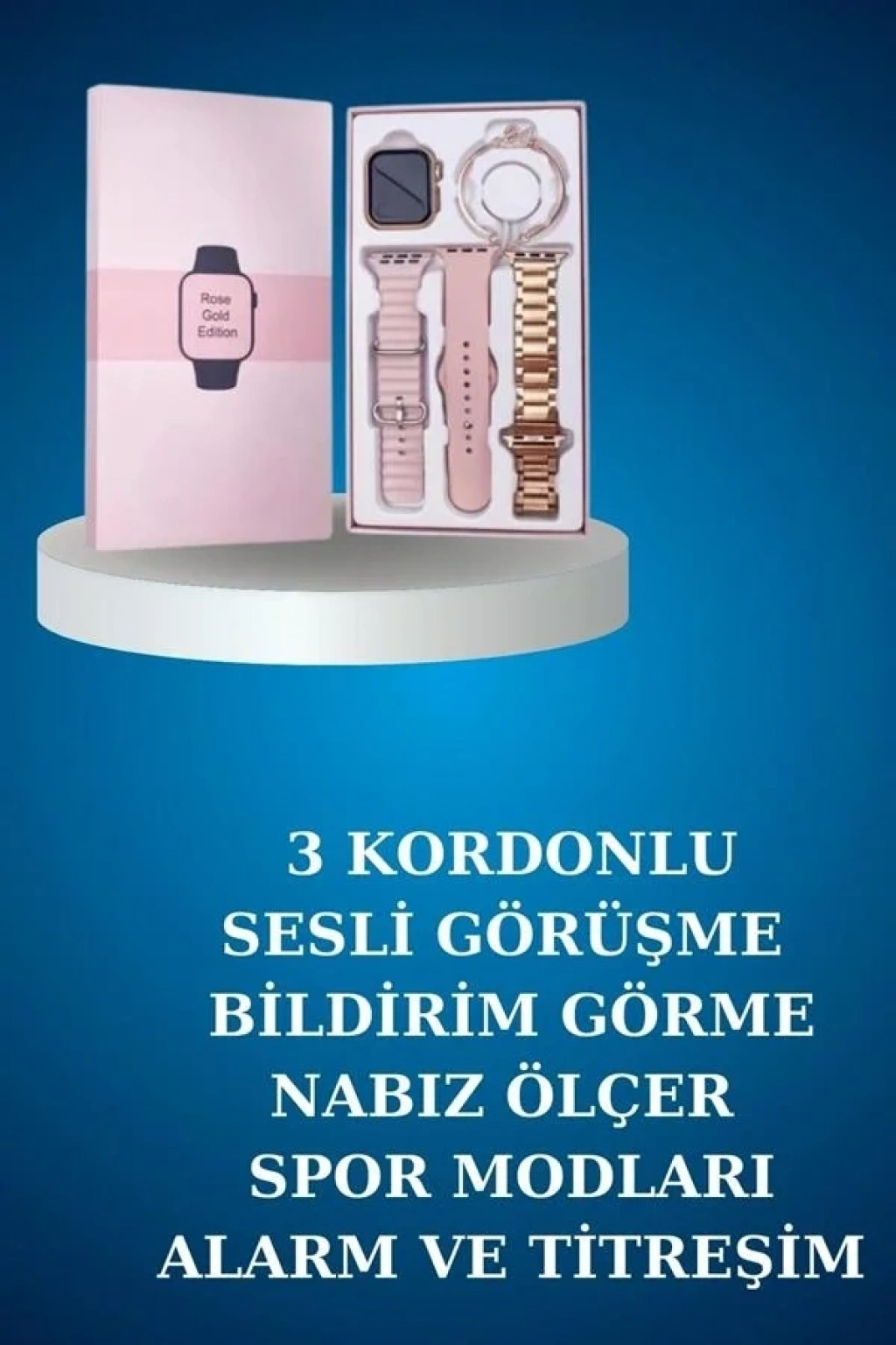 AKILLI SAATYeni Nesil Mini Kadın Akıllı Saat, şıklığı ve fonksiyonelliği bir araya getiren tasarımıyla kadınlar için ideal bir seçenek sunuyor. Almanya üretimi ultra dayanıklı model, özel wireless şarj özellikleriyle öne çıkıyor ve Türkçe menüsü sayesinde kullanıcı dostudur. Kutu içeriğinde, mini akıllı saat, 3 farklı kordon, hediye bileklik, wireless şarj kablosu ve kullanım kılavuzu bulunmaktadır. Şık pembe kutusu, hediye olarak tercih edilmesini sağlayan bir özellik taşır. 41 mm kavisli oval kenarlı yeni tasarımı ve 1,70 inç AMOLED ekranı ile yüksek çözünürlükte HD görüntü sağlar.Saat, nabız ölçer, uyku izleyici, kan basıncı, tansiyon, EKG ve vücut sıcaklığı ölçer gibi sağlık izleme özellikleriyle sağlığınızı takip etmenizi sağlar. 117 farklı spor modu ve adım, kalori, kalp ritmi ölçme gibi özellikler ile aktivite takibini oldukça detaylı yapabilirsiniz. Ayrıca akıllı hatırlatıcılar sayesinde su içme ve hareketsizlik gibi hatırlatmalar alabilir, tüm bildirimleri ve mesajları anında saatinizde görebilirsiniz.Bluetooth bağlantısı ile yüksek kaliteli müzik dinleyebilir ve uzaktan fotoğraf çekme özelliği ile fotoğraflarınızı kolayca çekebilirsiniz. Suya dayanıklı yapısı, günlük kullanımda sıklıkla tercih edilmesini sağlar; ancak deniz ve havuz gibi basınçlı suya karşı su geçirmez.Saatin sunduğu diğer özellikler arasında Türkçe ve çoklu dil desteği, saatimi bul, telefonumu bul, alarm, kronometre, hava durumu, hesap makinesi gibi fonksiyonlar bulunur. Kordonu değiştirilebilir, bu sayede kişisel tercihlere göre tasarımı özelleştirilebilir. 24 ay garanti süresi ile kullanıcılarına güvenli bir deneyim sunar.KULAKLIKBluetooth kulaklık, ortalama 100 saatlik kullanım süresi sunar (ses yüksekliği ve diğer koşullara bağlı olarak değişebilir). Dahili LCD ekranı sayesinde şarj seviyesini kolayca kontrol edebilirsiniz. Kulaklık, tuşlar üzerinden müzik ve arama kontrolleri yapmanıza olanak tanırken, ayrıca sesli asistana erişim sağlamanızı da mümkün kılar.Bluetooth 5.3 çipi ile donatılmış olan bu kulaklık, oyunlar ve diğer aktiviteler sırasında minimum gecikme ile yüksek kaliteli ses aktarımı sağlar. Ürün kutusu,Bluetooth kulaklık, Type-C şarj kablosu, kullanım kılavuzu ve yedek silikon uçlar içerir, böylece ihtiyacınız olan her şey elinizin altında olur.