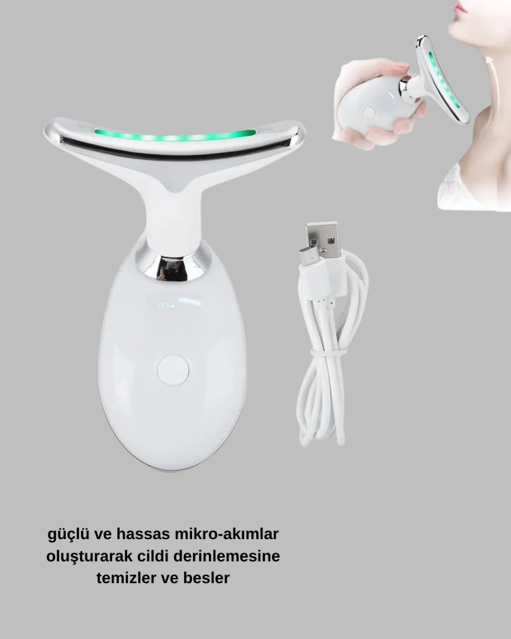 Evde profesyonel cilt bakımı deneyimi yaşamak isteyenler için özel olarak tasarlanmış bu cihaz, yüz ve boyun bölgesinde etkili bir sıkılaştırma sağlar. Mikro akım teknolojisi sayesinde cilt kaslarını uyarır, kolajen üretimini artırır ve yaşlanma belirtilerini azaltır. Gıdı toparlama, kırışıklık giderme ve sarkma önleme gibi birçok işlevi bir arada sunar.Cihazın 3 farklı modu vardır: Temizleme, EMS bakım ve nemlendirme. Her mod farklı bir cilt ihtiyacına yanıt verir. Isı terapisi, kan dolaşımını hızlandırarak cilt sağlığını destekler. 7000 titreşim/dakika özelliğiyle cilt daha canlı ve parlak hale gelir.Taşınabilir ve hafif tasarımı, günlük kullanım için idealdir. USB üzerinden kolayca şarj edilir ve 2 saatte tam dolum sağlar. Tek şarjla uzun süreli kullanım mümkündür. Düzenli kullanımda cilt daha genç, daha sıkı ve daha sağlıklı bir görünüme kavuşur. Kimyasal içermez, tamamen doğal ve güvenli bir yöntemle cildinizi yeniler.