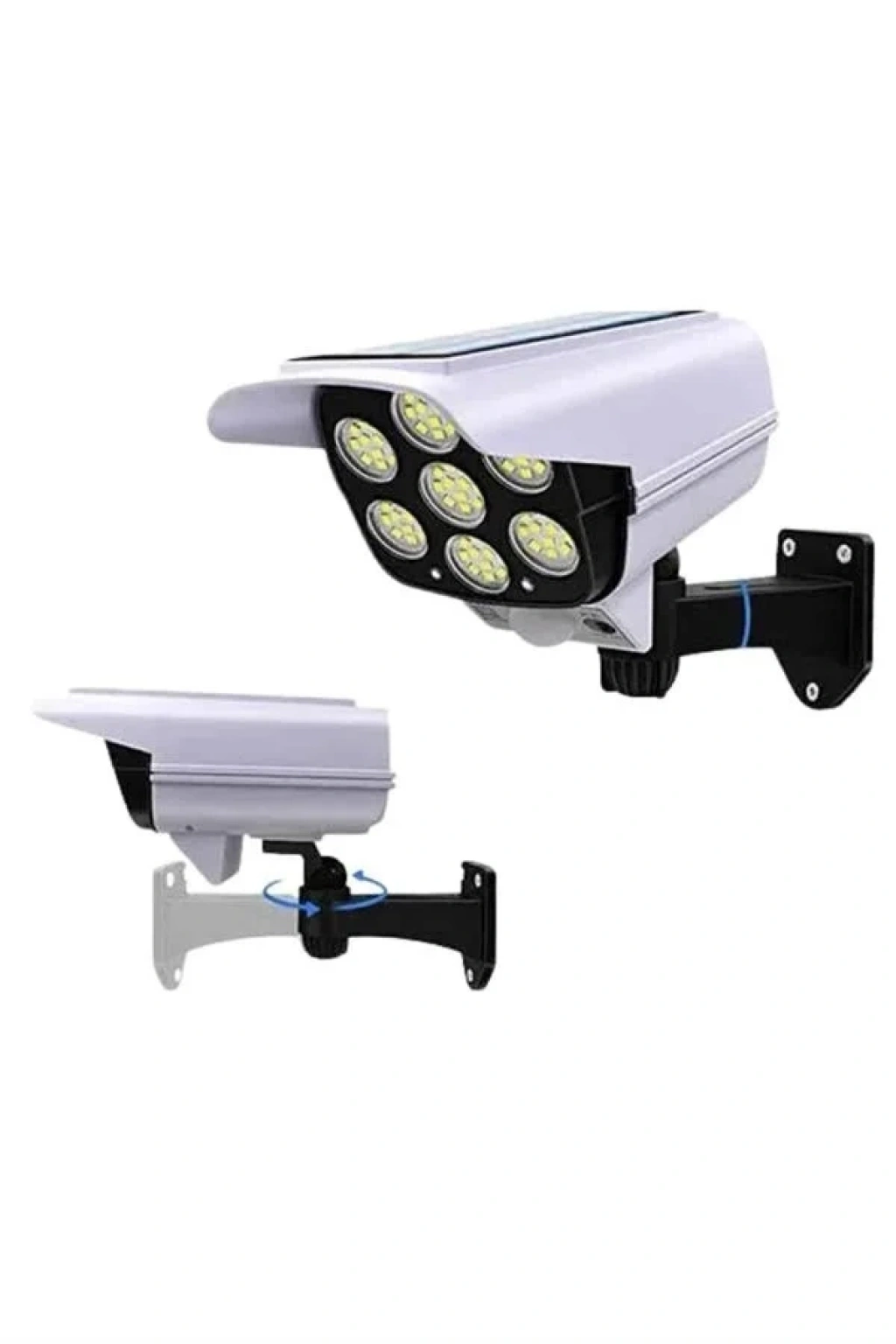Çift Fonksiyonlu TasarımSahte güvenlik kamerası görünümü sayesinde caydırıcı bir etki yaratırken, aynı zamanda güçlü LED aydınlatmasıyla bahçenizi veya dış mekanınızı aydınlatır. Hem güvenlik hem de dekoratif amaçlı kullanım için idealdir. Güneş Enerjisi ve Uzun Süreli Pil Kullanımı2400mAh yüksek kapasiteli pili sayesinde düşük ışık modunda 40 saate kadar kesintisiz çalışabilir. Ek olarak, güneş paneli sayesinde güneş ışığını emerek enerji tasarrufu sağlar, çevre dostu bir kullanım sunar. Akıllı Hareket Sensörü ile Otomatik AydınlatmaDahili PIR hareket sensörü, 10-20 fit mesafede ve 120 derece aralığında hareket algıladığında ışığı otomatik olarak ler. Bahçe, garaj, sundurma veya çim alanlar için mükemmel bir güvenlik aydınlatması sunar. Kolay Kurulum ve Suya Dayanıklı YapıIP66 su geçirmez özelliği sayesinde zorlu hava koşullarına karşı dayanıklıdır. 5 eksenli dönebilen tasarımı ile güneş panelinin ve ışık açısının en iyi şekilde ayarlanmasını sağlar. Kolay montaj imkanı sunarak pratik bir kullanım deneyimi yaşatır.