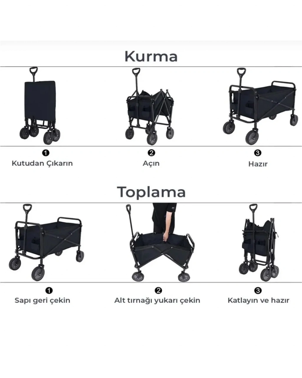 Katlanabilir Taşınabilir Kamp Arabası, açık hava aktivitelerinde, günlük taşıma ihtiyaçlarında ve ev kullanımında pratiklik sunmak üzere tasarlanmış çok yönlü bir taşıma vagonudur. Kamp, plaj, bahçe işleri, alışveriş ve piknik gibi farklı kullanım alanlarında eşyaların zahmetsiz şekilde taşınmasına yardımcı olur. Özellikle hareket halindeyken ağır ve hacimli eşyalarla uğraşmak istemeyen kullanıcılar için ideal bir çözümdür.Katlanabilir tasarımı sayesinde kullanım sonrasında saniyeler içinde katlanarak kompakt bir hale gelir. Bu özellik, ürünün bagajda, evde veya depolama alanlarında minimum yer kaplamasını sağlar. Montaj gerektirmeyen yapısı sayesinde kutudan çıkarıldığı anda kullanıma hazırdır. Katlamak için alt orta kemerin yukarı kaldırılması yeterlidir, böylece pratik ve hızlı bir kullanım sunar.Geniş iç hacmi ve maksimum 74,8 kg taşıma kapasitesi, büyük ve ağır eşyaların güvenle taşınmasına olanak tanır. Piknik malzemeleri, kamp ekipmanları, bahçe aletleri veya alışveriş torbaları rahatlıkla taşınabilir. Ayrıca küçük eşyalar için tasarlanmış 2 adet ekstra cep, düzenli kullanım avantajı sağlar.Ön tekerleklerin 360 derece dönebilme özelliği, arabaya yüksek manevra kabiliyeti kazandırır. Kum, çakıl, çimen ve toprak gibi farklı zeminlerde rahat bir sürüş sunar. Bu sayede plajda, kampta veya bahçede yön değiştirmek son derece kolaydır.Ayarlanabilir kulp sistemi, kullanıcı boyuna ve kullanım açısına göre esnek ayarlama imkânı tanır. Kilitlenebilir yapısı sayesinde kullanım sırasında sabit kalır ve güvenli bir sürüş sağlar. Çerçevesi toz boya kaplı çelikten üretilmiş olup deformasyona karşı dayanıklıdır. 600D Oxford kumaşı ise yırtılmaya karşı dirençlidir ve çıkarılarak kolayca temizlenebilir.Katlanabilir Kamp Arabası, dayanıklılığı, geniş kapasitesi ve kullanım kolaylığı ile açık hava ve günlük taşıma ihtiyaçlarında güvenilir bir yardımcıdır.