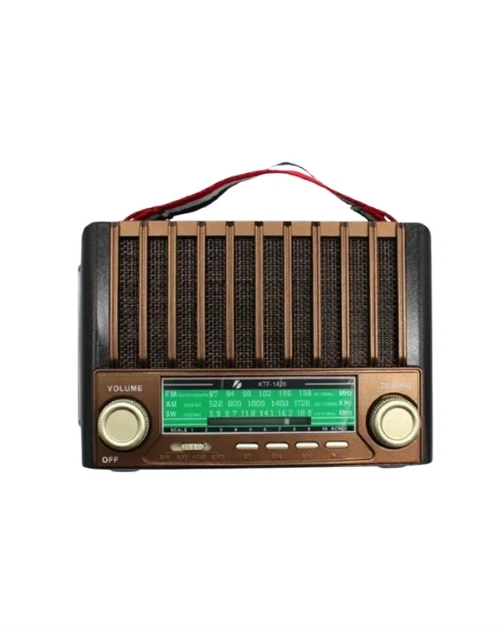 KTF-1428, klasik radyolardan ilham alan tasarımıyla nostalji severler için şıklığı ve teknolojiyi bir araya getiriyor. Güneş paneli sayesinde çevre dostu ve mobil bir müzik deneyimi sunar. Cihaz, USB bellek ve SD kartlardaki MP3 dosyalarını destekler; böylece harici bir oynatıcıya ihtiyaç duymadan doğrudan müzik dinleyebilirsiniz. FM, AM ve SW bantları ile radyo yayınlarını da kesintisiz dinleyebilirsiniz. Bluetooth özelliği sayesinde mobil cihazlarla anında eşleşir. Şarj edilebilir bataryası, portatif taşıma kolu, 220V AC ve 6V DC güç seçenekleri ile her yerde kullanılabilir. Evde, parkta, piknikte ya da seyahatte yanınızdan ayırmak istemeyeceğiniz çok yönlü bir müzik çözümüdür.