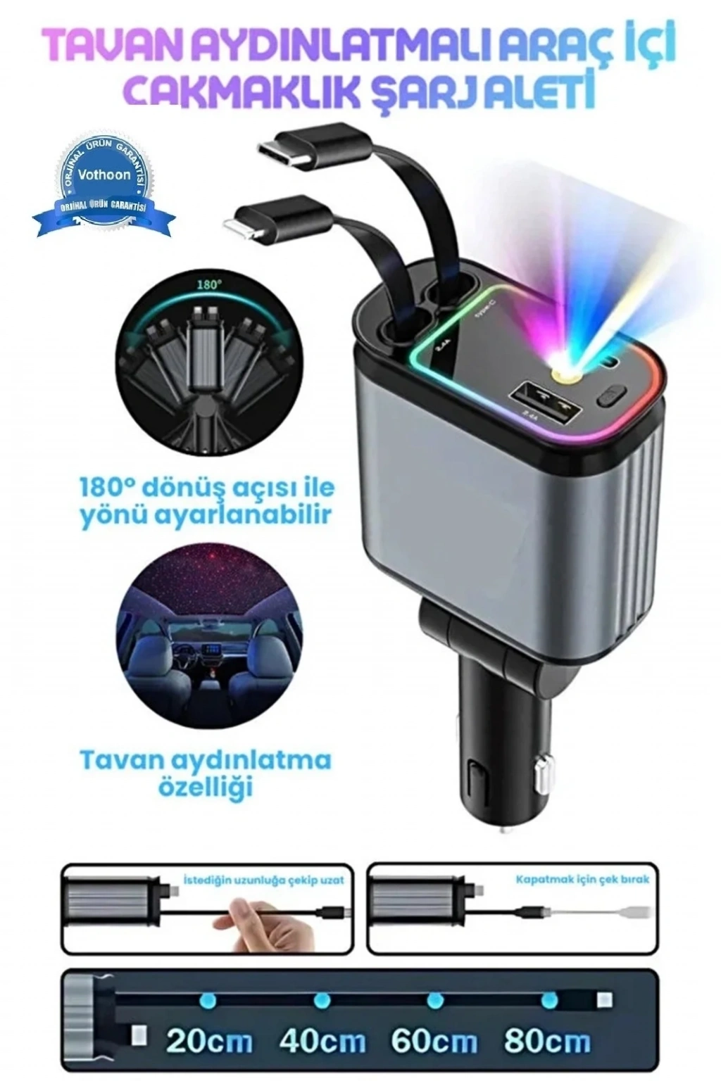 Aracınızdaki kablo karmaşasına son verin ve şarj deneyiminizi bir üst seviyeye taşıyın! 66W Süper Hızlı Araç Şarj Aleti, sadece cihazlarınızı şarj etmekle kalmaz, üzerindeki Yıldızlı Gökyüzü LED Projeksiyonu ile aracınızın tavanına estetik bir atmosfer katar. Hem fonksiyonel bir teknoloji harikası hem de şık bir aksesuar arayanlar için tasarlandı.