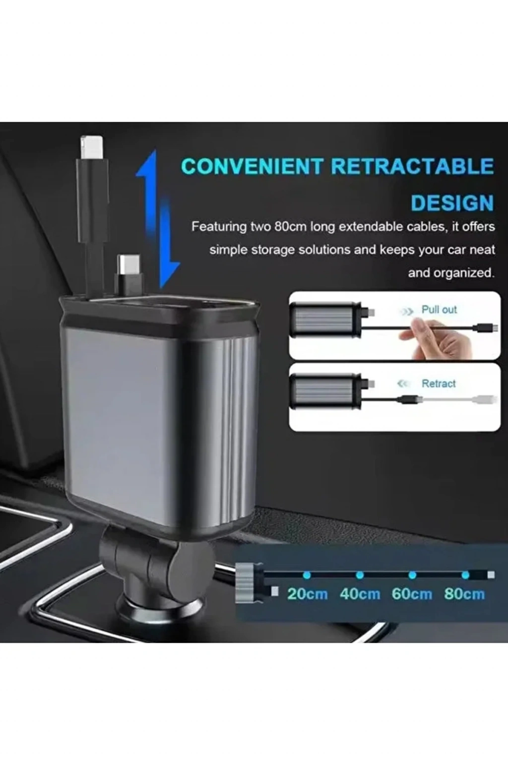 Kabloların birbirine dolanmasından bıktınız mı? Her biri 80 cm uzunluğa sahip makaralı kabloları ihtiyacınız kadar çekin, işiniz bittiğinde hafifçe çekip bırakın; otomatik olarak yuvasına dönsün. Aracınız her zaman düzenli ve temiz kalsın.