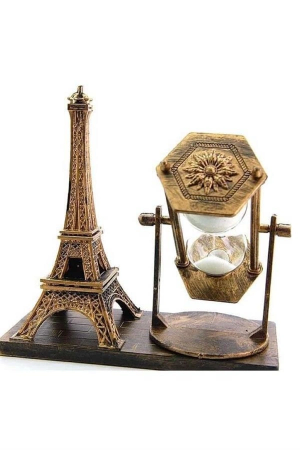 Demir Kule Temalı Dekoratif TasarımBu özel tasarım kum saati, dünyaca ünlü Demir Kule siluetiyle süslenmiştir ve her detayında zarif işçilik hissedilir. Klasik ve vintage tarzı benimseyenler için mükemmel bir dekoratif obje olmasının yanı sıra, nostaljik bir hava katmak isteyenler için de harika bir seçimdir. Şık metal çerçevesi ve dayanıklı cam bölmesi sayesinde, hem ev hem de ofis ortamlarında kullanım için uygundur. Çalışma masaları, kitaplıklar, sehpa üstleri veya vitrinlerde sergilendiğinde ortama sofistike bir hava katar.