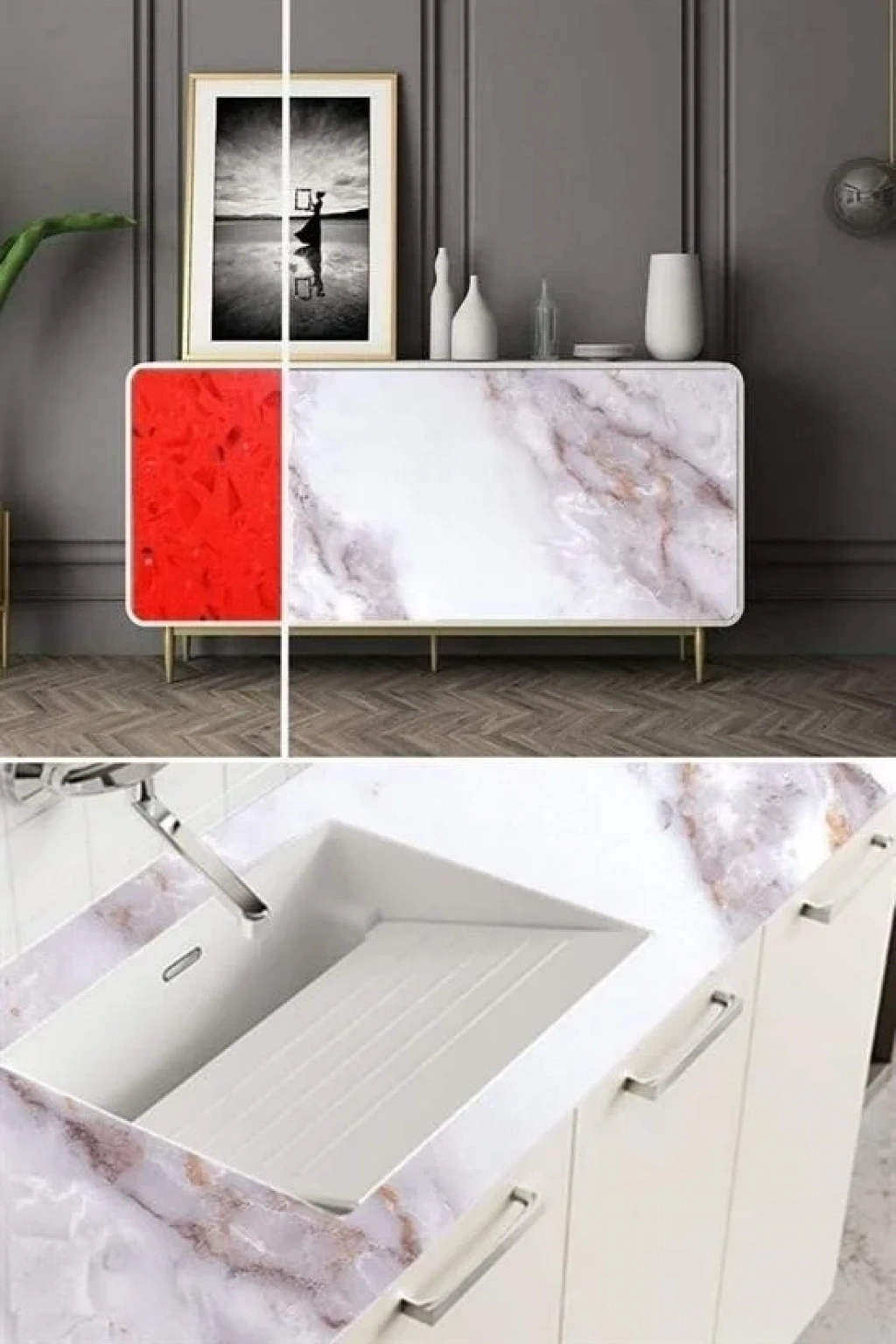 Mermer görünümlü folyoyu dilediğiniz yere kolayca yapıştırabilir ve sonrasında leke olmadan ürünü çıkarabilrsiniz