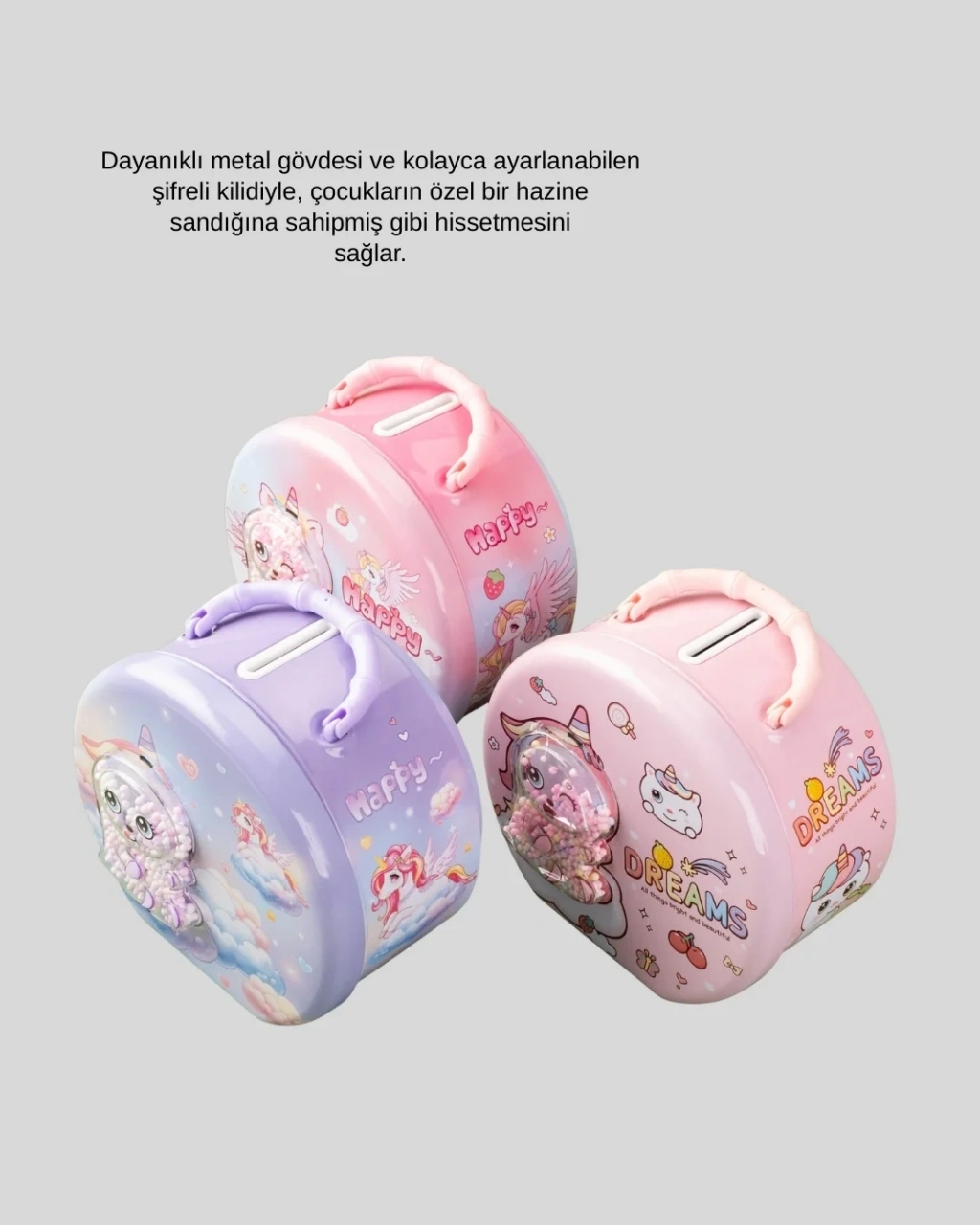 Bu şifreli çocuk kasası, çocukların biriktirme alışkanlığı edinmesini destekleyen güvenli ve eğitici bir üründür. Metal gövdesi sayesinde darbelere karşı dayanıklıdır ve uzun süreli kullanım sunar.Kolay ayarlanabilen şifreli kilit mekanizması, çocukların kasayı rahatça açıp kapatmasını sağlar. Bu özellik, çocukların özgüvenini artırırken kendilerine ait bir alan hissi kazandırır.Hem saklama kutusu hem dekoratif bir obje olarak kullanılabilir. Doğum günü, Çocuk Bayramı ve yılbaşı gibi özel günlerde anlamlı bir hediye seçeneğidir.