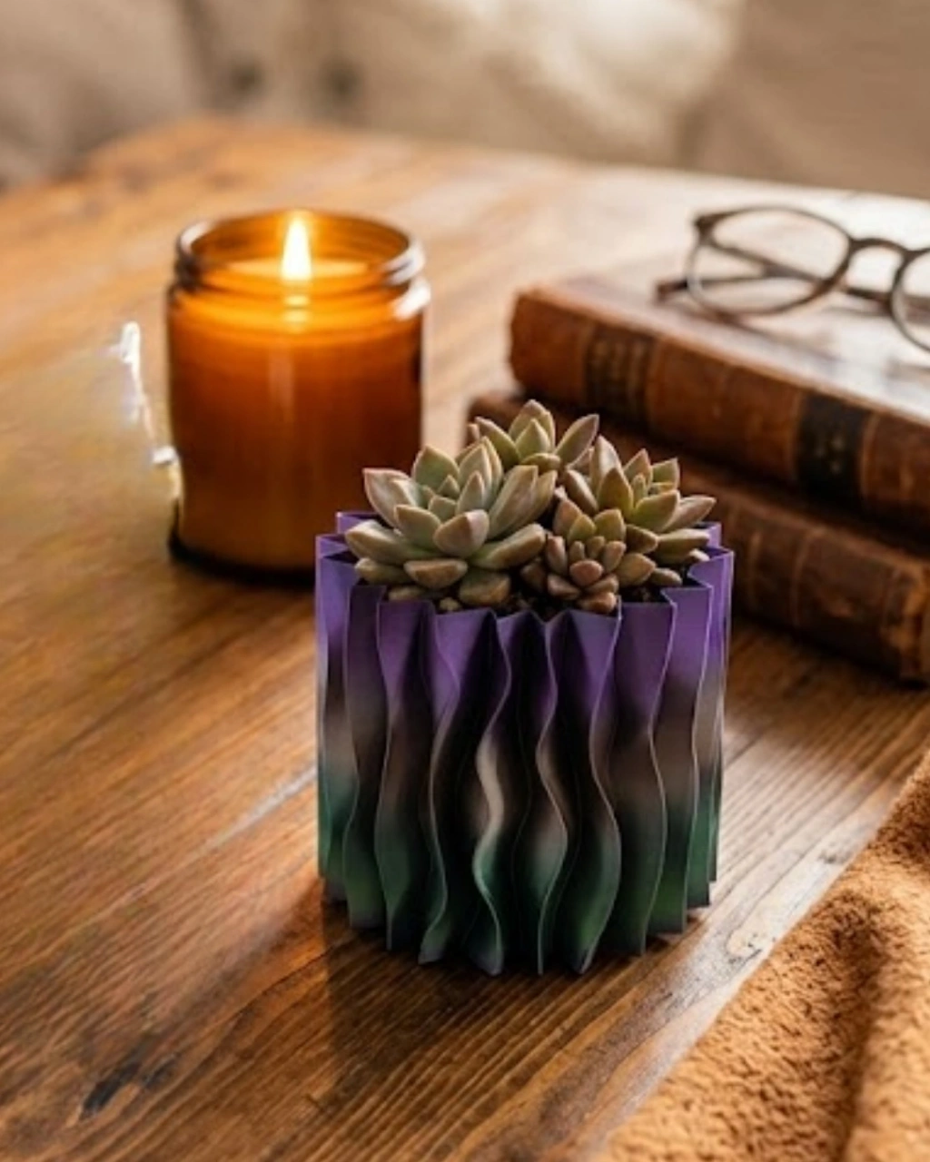 Modern dalgalı tasarımlı mor 3D dekoratif vazo, es görünümü ve özgün formu ile yaşam alanlarında dikkat çeken dekoratif ürünlerden biridir. Dalga formunda tasarlanmış yüzey yapısı sayesinde klasik vazolardan farklı bir görünüm sunar ve bulunduğu ortama modern bir karakter kazandırır. Mor renk tonları ile birleşen bu tasarım hem zarif hem de sanatsal bir dekoratif obje olarak kullanılabilir.3D baskı teknolojisi kullanılarak üretilen bu dekoratif vazo, yüzeyindeki dalgalı form sayesinde ışık ile farklı açılarda farklı gölgeler oluşturarak görsel bir derinlik hissi yaratır. Bu sayede ürün bulunduğu ortamda yalnızca bir vazo değil aynı zamanda dekoratif bir sanat objesi olarak da dikkat çeker. Modern dekorasyon anlayışını yansıtan bu tasarım minimalist ve es dekorasyon konseptleri ile uyumlu bir kullanım sunar.Mor renk dekorasyon dünyasında zarafet ve es ile ilişkilendirilen renklerden biridir. Bu nedenle mor dekoratif vazo özellikle modern ev dekorasyonlarında, minimalist dekorasyon stillerinde ve sanatsal dekorasyon konseptlerinde oldukça şık bir tamamlayıcı aksesuar olarak kullanılabilir.Dekoratif mor 3D vazo özellikle kuru çiçekler, dekoratif dallar veya minimal bitki düzenlemeleri için oldukça uygun bir kullanım sunar. Bunun dışında masa dekoru, raf dekoru veya sehpa üzerinde dekoratif obje olarak da kullanılabilir. Çok yönlü kullanım özelliği sayesinde hem ev dekorasyonunda hem de ofis dekorasyonunda tercih edilebilir.Salon, çalışma odası, kitaplık veya ofis masası üzerinde kullanıldığında bulunduğu ortama es bir atmosfer kazandırır. Modern dekorasyon, minimalist dekorasyon ve sanatsal dekorasyon stilleri ile uyum sağlayabilecek bir tasarıma sahiptir.Modern dalgalı tasarımlı mor 3D dekoratif vazo aynı zamanda dekoratif hediye alternatifi olarak da tercih edilebilir. Ev hediyesi, yeni ev hediyesi veya doğum günü hediyesi olarak oldukça şık bir seçenektir.Es tasarımı ve modern görünümü sayesinde bu dekoratif vazo yaşam alanlarında dikkat çeken şık bir dekoratif aksesuardır.