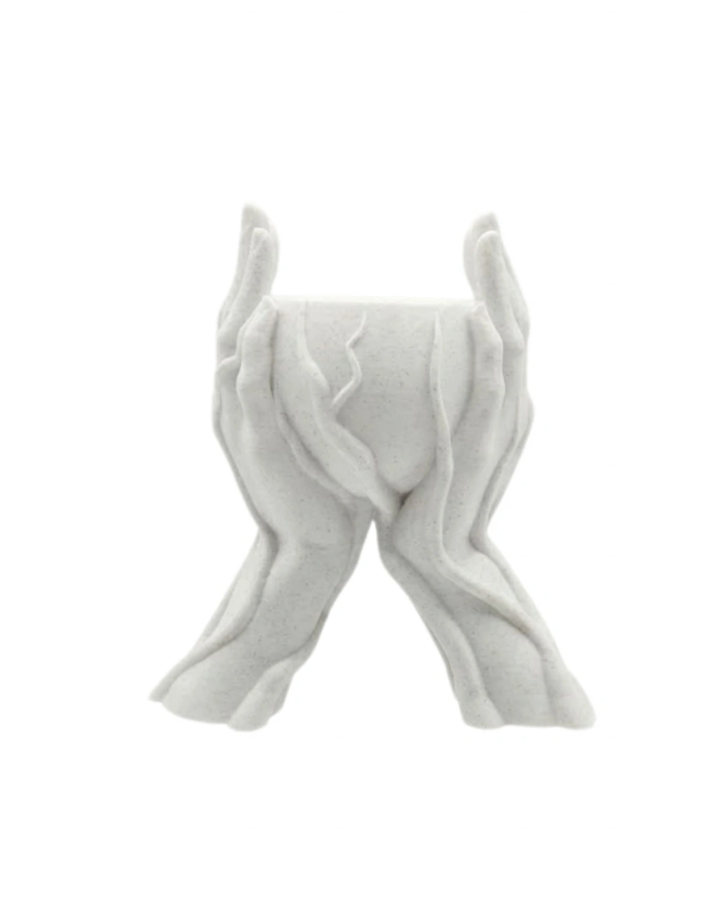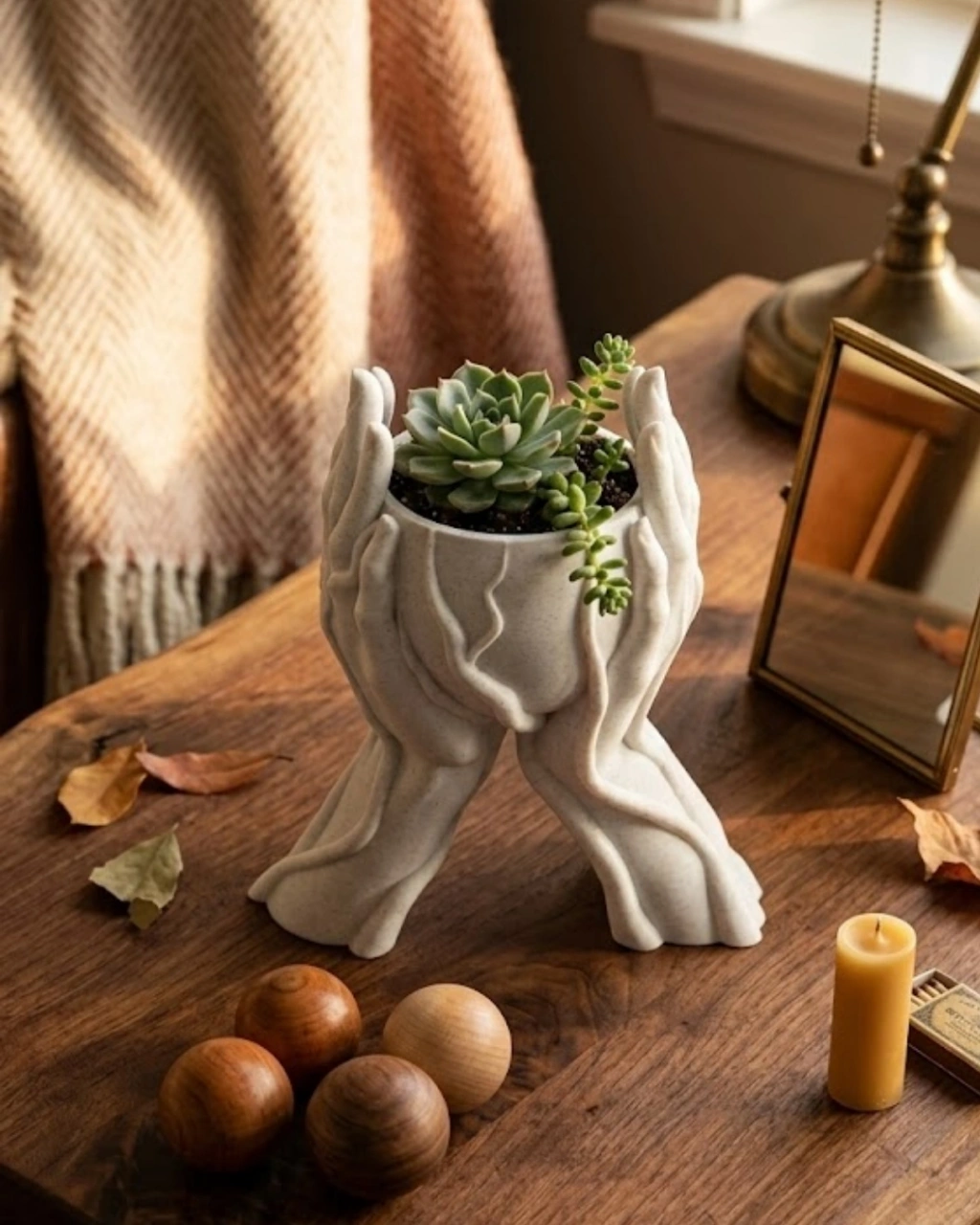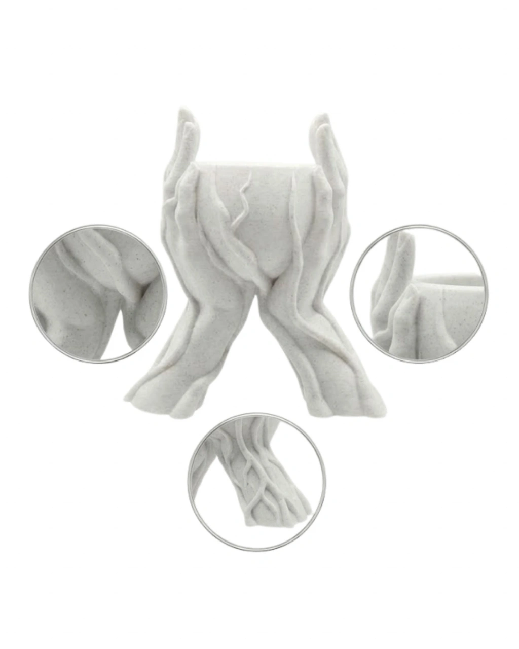 Dekoratif 3D el tasarımlı vazo saksı, modern dekorasyon anlayışı ile sanatsal tasarımın birleştiği es bir dekoratif üründür. Özgün formu sayesinde yaşam alanlarında dikkat çeken bir dekor objesi olarak kullanılabilir. İki elin bir objeyi tutuyormuş gibi tasarlanması ürüne hem güçlü bir görsel etki hem de modern bir karakter kazandırır. Bu tasarım yalnızca bir saksı veya vazo olarak değil aynı zamanda sanatsal bir dekoratif obje olarak da değerlendirilebilir.3D baskı teknolojisi kullanılarak üretilen bu dekoratif vazo, detaylı el formu ve akıcı yüzey tasarımı sayesinde oldukça es bir görünüm sunar. Eller tarafından destekleniyormuş hissi veren bu tasarım, minimalist ve modern dekorasyon anlayışını yansıtan farklı bir stil ortaya çıkarır. Ev dekorasyonu, ofis dekorasyonu veya çalışma alanlarında kullanıldığında bulunduğu ortama sanatsal bir atmosfer kazandırır.Dekoratif el tasarımlı saksı vazo özellikle küçük bitkiler için oldukça uygun bir kullanım sunar. Sukulent bitkiler, kaktüsler veya küçük dekoratif çiçekler ile birlikte kullanıldığında hem doğal hem de es bir görünüm elde edilir. Bunun yanında masa dekoru, kalemlik veya raf süsü olarak da değerlendirilebilir. Bu çok yönlü kullanım özelliği ürünü hem dekoratif hem de fonksiyonel bir aksesuar haline getirir.Salon, çalışma odası, kitaplık, televizyon ünitesi veya ofis masası üzerinde kullanıldığında bulunduğu ortama modern bir dokunuş kazandırır. Minimalist dekorasyon, modern dekorasyon ve sanatsal dekorasyon stilleri ile uyum sağlayabilecek bir tasarıma sahiptir.Dekoratif 3D el tasarımlı vazo aynı zamanda hediye alternatifi olarak da oldukça özel bir üründür. Ev hediyesi, yeni ev hediyesi, doğum günü hediyesi veya ofis hediyesi olarak tercih edilebilir. Modern tasarımı ve es görünümü sayesinde dekorasyon meraklıları için oldukça dikkat çekici bir üründür.Modern tasarımı, sanatsal formu ve çok amaçlı kullanım imkanı sayesinde dekoratif el tasarımlı 3D vazo yaşam alanlarında şık ve dikkat çekici bir dekor ürünü olarak öne çıkar.