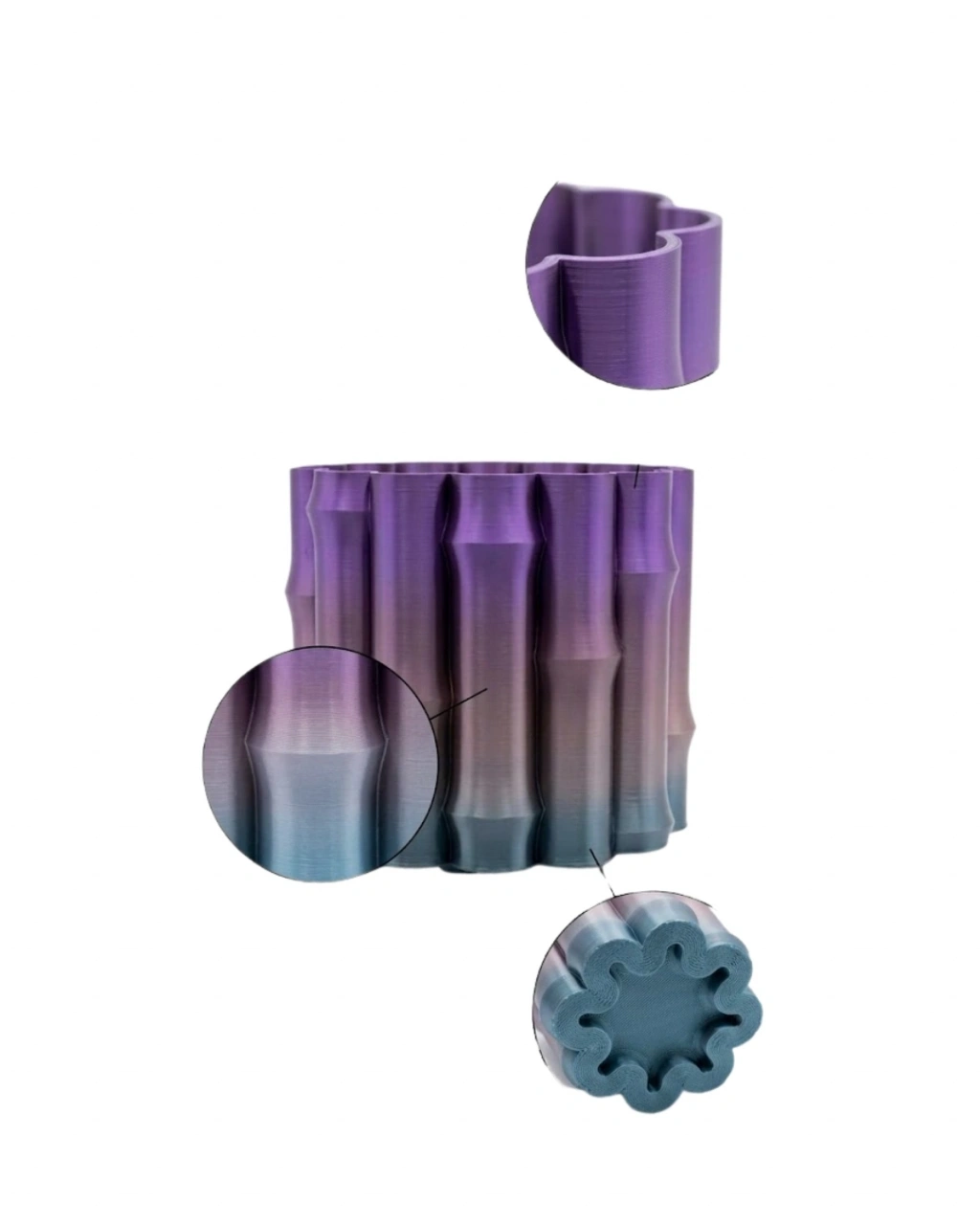 Es ve modern tasarımı bir araya getiren bu mor gri dekoratif vazo, yaşam alanlarında fark yaratmak isteyenler için ideal bir dekorasyon ürünüdür. Renk geçişlerindeki uyum ve yüzey tasarımındaki detaylar sayesinde bulunduğu ortamda dikkat çekici bir görünüm oluşturur. Minimal tasarım anlayışı ile sade ama etkili bir dekoratif obje olarak öne çıkar.Ürünün silindirik yapısı ve yüzeyindeki özel form detayları, klasik vazolardan farklı bir duruş sergilemesini sağlar. Mor ve gri tonlarının dengeli geçişi, modern dekorasyon anlayışına uygun bir atmosfer oluşturur. Işık altında farklı tonlar yansıtarak ortama derinlik kazandırır.Kullanım alanı oldukça geniştir. Salon, yatak odası, ofis, çalışma masası, kitaplık veya TV ünitesi üzerinde rahatlıkla kullanılabilir. Tek başına dekoratif bir obje olarak kullanılabileceği gibi, içerisine yerleştirilecek çiçeklerle daha zengin bir görünüm elde edilebilir.Dayanıklı malzemesi sayesinde uzun ömürlü kullanım sunar. Hafif yapısı ile kolay taşınabilir ve farklı alanlarda pratik şekilde konumlandırılabilir. Modern ve şık tasarımı sayesinde hem günlük kullanım hem de hediye alternatifi olarak tercih edilebilir.