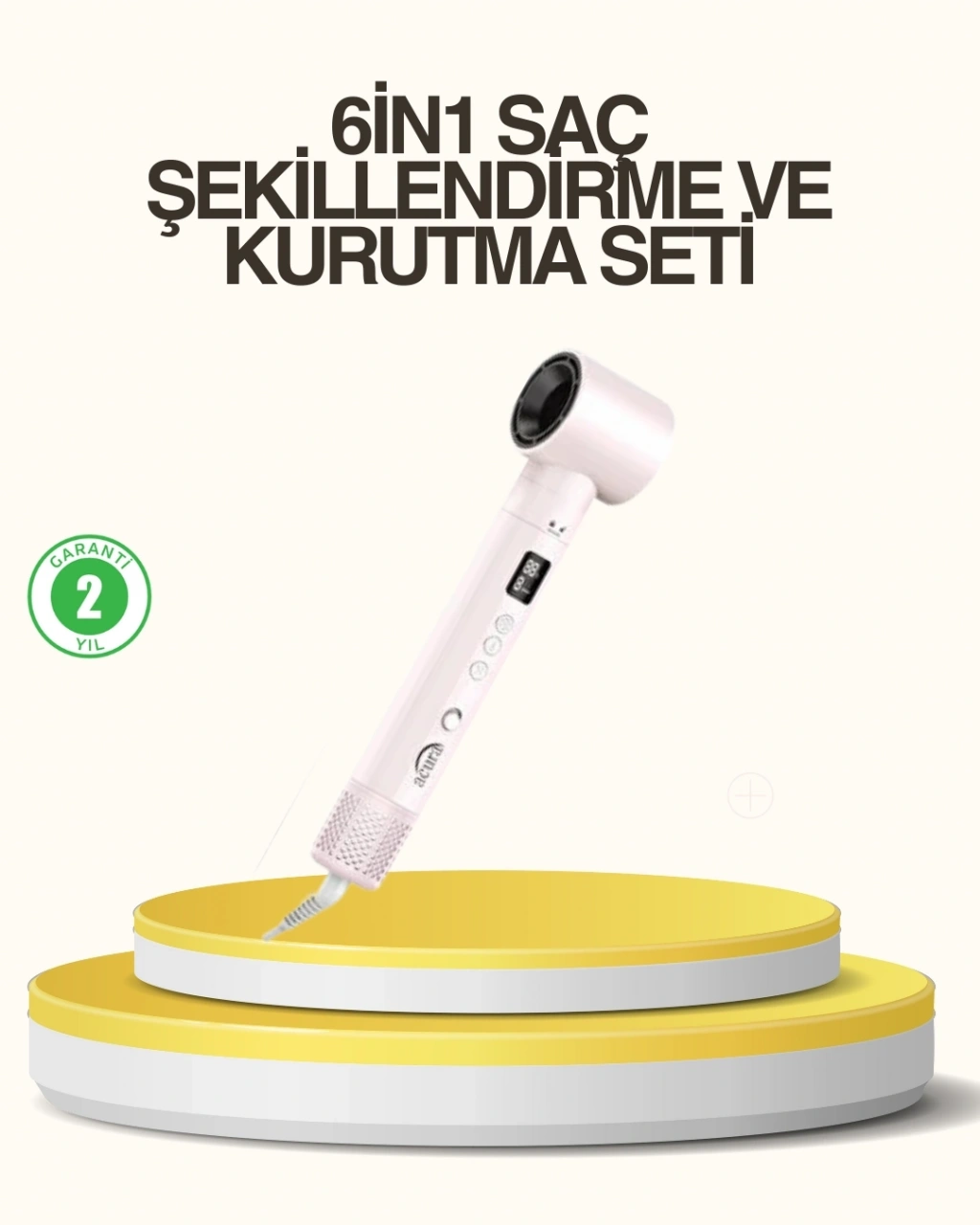 Airstyle 6-in-1 Saç Şekillendirme Seti, teknolojiyi saç bakım rutininize entegre eden yenilikçi bir üründür. Gelişmiş motor yapısı ve akıllı ısı kontrol sistemi sayesinde saçlarınıza zarar vermeden etkili sonuçlar elde etmenizi sağlar.110.000 rpm motor hızı, güçlü fakat dengeli hava akışı sunarak saçların hızlı şekilde kurumasına yardımcı olur. Bu sayede saç telleri yüksek ısıya uzun süre maruz kalmaz ve doğal yapısını korur. Negatif iyon teknolojisi, saç kütikülünü kapatarak parlaklık ve yumuşaklık kazandırır.LCD ekranlı kontrol paneli, kullanım sırasında anlık bilgi sunar. 3 kademeli sıcaklık ve hız ayarı, farklı saç tiplerine uygun kişisel ayarlamalar yapmanıza olanak tanır. Akıllı ısı kontrolü, saçın aşırı ısınmasını önleyerek kırılma ve kuruma riskini azaltır.Çoklu başlık seçenekleri, cihazın kullanım alanını genişletir. Bukle başlıkları ile hacimli ve doğal dalgalar, düzleştirme fırçası ile pürüzsüz saçlar elde edilebilir. Hacimlendirici fırça, saç diplerinden itibaren dolgun bir görünüm sunar.Soğuk üfleme özelliği, şekillendirme işlemi sonrasında saçın formunu sabitlemeye yardımcı olur. Ergonomik tasarımı ve hafif yapısı, uzun süreli kullanımlarda konfor sağlar. Evde profesyonel saç şekillendirme deneyimi yaşamak isteyenler için ideal bir settir.2 yıl garanti desteği ile sunulan bu ürün, güvenli ve uzun ömürlü kullanım sağlar. Günlük saç bakımını pratik hale getirirken es sonuçlar elde etmenizi mümkün kılar.