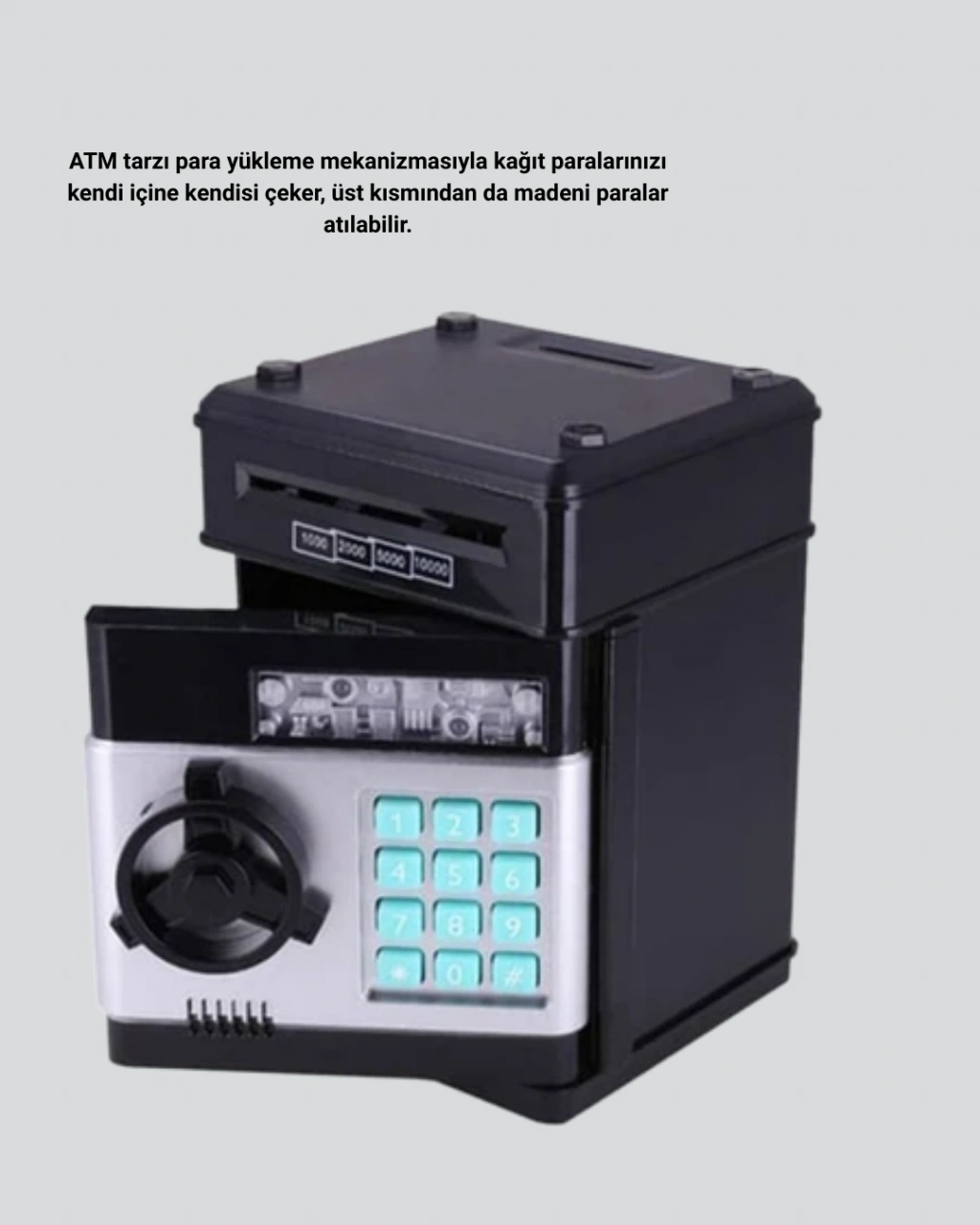 Para kasası görünümüne sahip bu elektronik şifreli kumbara, tasarrufu güvenli ve keyifli hale getirir. Klasik kumbaralardan farklı olarak ATM tarzı mekanizması ile öne çıkar. Kâğıt lar otomatik olarak içine çekilir, bozuk lar kolayca atılabilir.4 haneli şifreli sistem, larınızı güvenle saklamanızı sağlar. Yanlış şifre girildiğinde kapak açılmaz. Doğru şifre girildiğinde ışık ve sesli uyarılar devreye girer. Varsayılan şifre kullanıcı tarafından değiştirilebilir.Geniş iç hacmi sayesinde yalnızca değil, küçük kişisel eşyalar da saklanabilir. Dayanıklı ABS malzemesi, uzun süreli kullanım sunar. Çocuklara tasarruf alışkanlığı kazandırmak için ideal, yetişkinler için ise pratik bir mini kasa çözümüdür.