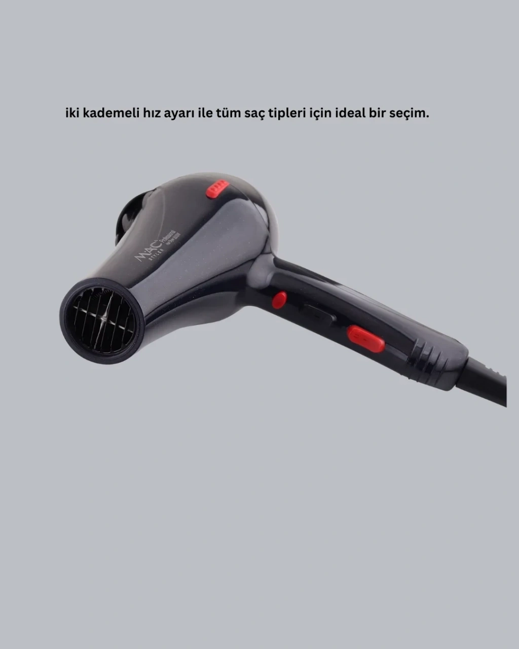2200 Watt AC motorlu Profesyonel Saç Kurutma Makinesi, güçlü hava akımı ve uzun ömürlü yapısıyla saç kurutma ve şekillendirme deneyiminizi üst seviyeye taşır. Profesyonel kuaförlerde kullanılan motor teknolojisi sayesinde hızlı ve yüksek performanslı üfleme sağlar. İki kademeli hız ayarı ile saç tipinize ve ihtiyacınıza göre hava akımını kolayca ayarlayabilirsiniz. Sıcak ve soğuk üfleme özellikleri sayesinde hem kısa sürede saç kurutabilir hem de yaptığınız fön işlemini sabitleyebilirsiniz.Cihazın ergonomik tasarımı kullanım sırasında maksimum konfor sağlar. Hafif gövde yapısı sayesinde el yorulmasını engeller ve uzun süreli kullanımlarda bile rahatlık sunar. Hem ev hem profesyonel kullanım için uygun olan bu saç kurutma makinesi, taşınabilir yapısıyla sık seyahat eden kullanıcılar için de idealdir. Gövdesi yüksek kaliteli malzemelerden üretildiği için yıllar boyunca dayanıklılığını korur.Profesyonel dar ağızlı başlık atı sayesinde hava akışını tek noktaya odaklayarak daha etkili şekillendirme sağlar. Bu özellik özellikle düzleştirme, hacim verme ve kabarıklığı azaltma işlemlerinde önemli avantaj sunar. Güçlü ve sürekli hava akımı saç tellerini daha parlak, canlı ve hacimli görünüme kavuşturur.Soğuk üfleme fonksiyonu saç şeklinizi sabitleyerek uzun süre kalıcı sonuçlar elde etmenizi sağlar. Mükemmel bir fön deneyimi sunan bu cihaz, ısı kontrolü sayesinde saçın yıpranmasını engeller ve sağlıklı şekillendirme sağlar. Motorunun sessiz çalışması sayesinde kullanım sırasında konforu artırır. 2200W gücündeki bu profesyonel saç kurutma makinesi, hız, güç ve ergonomiyi bir arada sunan ideal bir seçenektir.