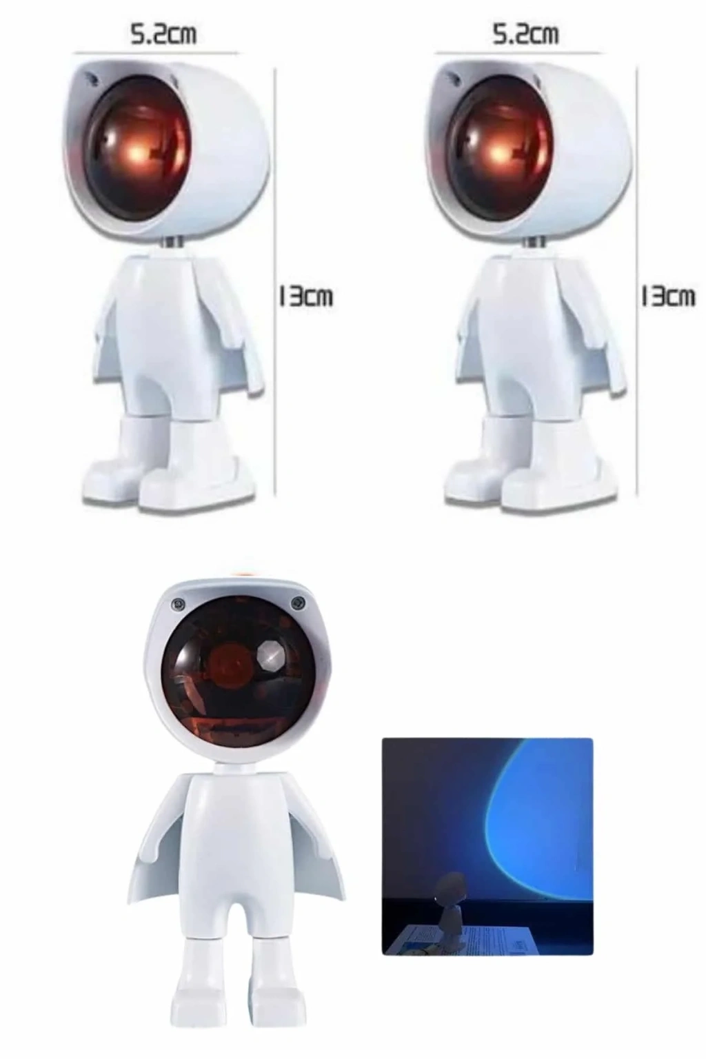 Bu şarjlı gün batımı lambası, sevimli astronot tasarımı ve sıcak renk tonlarıyla bulunduğu ortama hem es bir dokunuş hem de huzurlu bir atmosfer kazandırır. Gün batımı efektli ışık yayılımı sayesinde özellikle akşam saatlerinde loş ve dinlendirici bir ortam oluşturmak isteyen kullanıcılar için idealdir. Şık ve modern tasarımı, lambayı yalnızca bir aydınlatma aracı değil, aynı zamanda dekoratif bir obje haline getirir.Lambanın 5 Watt gücündeki LED ışığı, yumuşak ve göz yormayan bir aydınlatma sağlar. Kafasının 360 derece dönebilmesi ve 60 derece yukarı-aşağı hareket edebilmesi sayesinde ışığı istediğiniz yöne kolaylıkla ayarlayabilirsiniz. Bu esneklik, ister duvara gün batımı efekti yansıtmak ister kitap okurken odaklanmış bir ışık elde etmek isteyen kullanıcılar için büyük avantaj sunar.Ürün, USB ile şarj edilebilen dahili bataryası sayesinde prizden bağımsız çalışabilir ve tam şarjla 3-4 saate kadar kesintisiz aydınlatma sağlar. Evde, dış mekânda, seyahatlerde veya fotoğraf çekimlerinde rahatça kullanılabilir. Özellikle sosyal medya içerikleri, ürün çekimleri veya özel günlerde ambiyans yaratmak için oldukça uygundur.Dokunmatik kontrol özelliği, kullanıcı dostu bir deneyim sunarken aynı zamanda ışığın parlaklığını kolayca ayarlayabilmenizi sağlar. Gece lambası olarak da işlev görebilen bu ürün, uyku öncesi rahatlatıcı bir ortam sunar. Taşınabilir yapısı, ürünü istediğiniz her yerde kullanmanıza olanak tanır.Es ve işlevselliği bir araya getiren bu gün batımı lambası, ister kişisel kullanım ister dekoratif bir hediye alternatifi olarak her yaştan kullanıcıya hitap eder. Romantik ve sıcak bir atmosfer yaratmak isteyenler için ideal bir seçimdir.