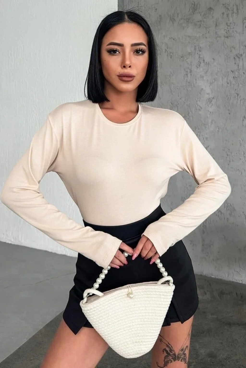 -Şimdi, gardırobunuzun olmazsa olmaz parçalarından biri olacak bu uzun kollu bisiklet yaka likralı bej viskon penye body'yi hemen satın alın ve her zaman rahat ve şık bir görünüme sahip olun
